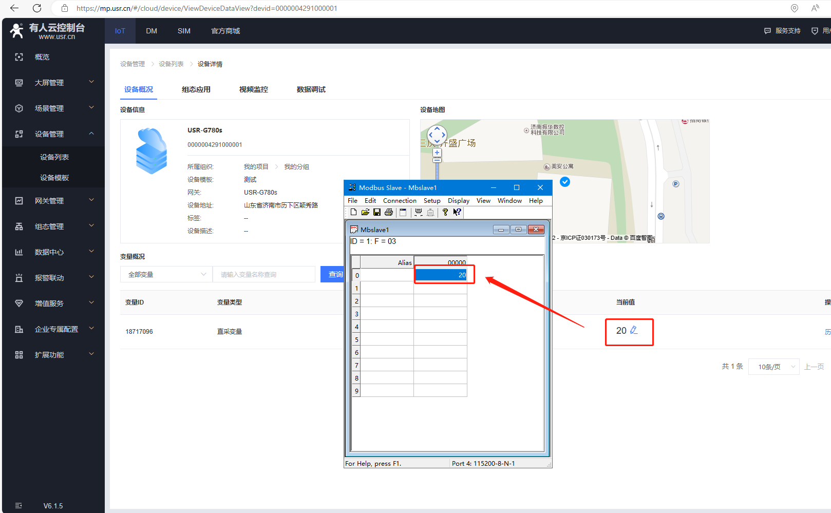 4、MODBUS slave數據設置10,有人云設備列表1分鐘采集,可以看到變量采集的當前值數據10。