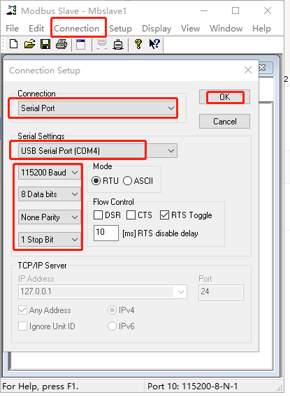 3、點擊Connection,選擇串口,對應USR-G780s所接USB-RS232串口線的COM口號,串口參數和USR-G780s串口參數保持一致。 Mode選擇RTU,模擬MODBUS RTU協議串口。