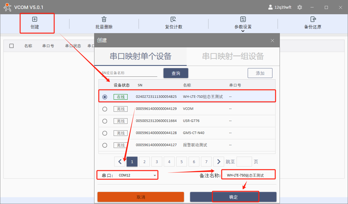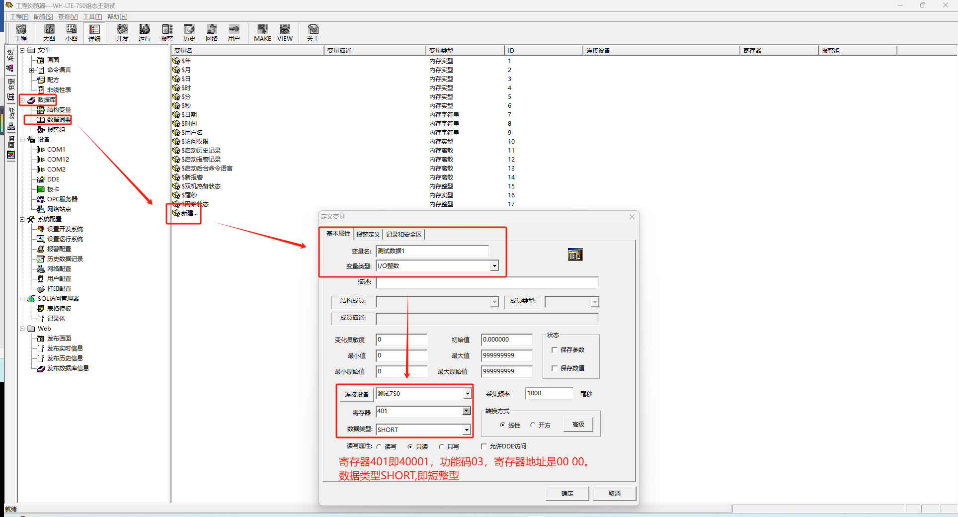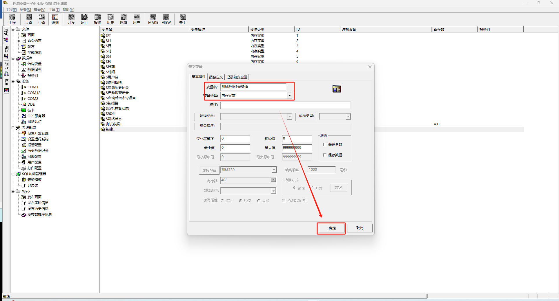 創建---選擇設備WH-LTE-7S0---選擇串口號COM12---備注名稱為WH-LTE-7S0組態王測試---確定