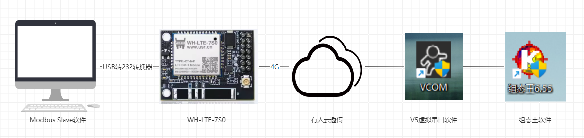 WH-LTE-7S0接入天線,插入到WH-LTE-7S0-EVK上,WH-LTE-7S0-EVK再插入USR-7SX-EVK底板上,底板上的232串口接USB-RS232串口線到電腦USB口,然后產品接12V電源適配器上線。