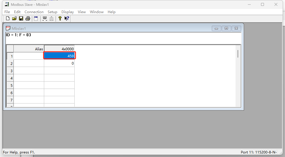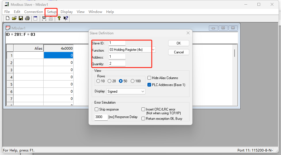 打開Modbus Slave軟件,引用USB轉232轉換器的COM端口號COM11
