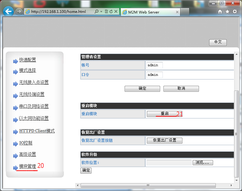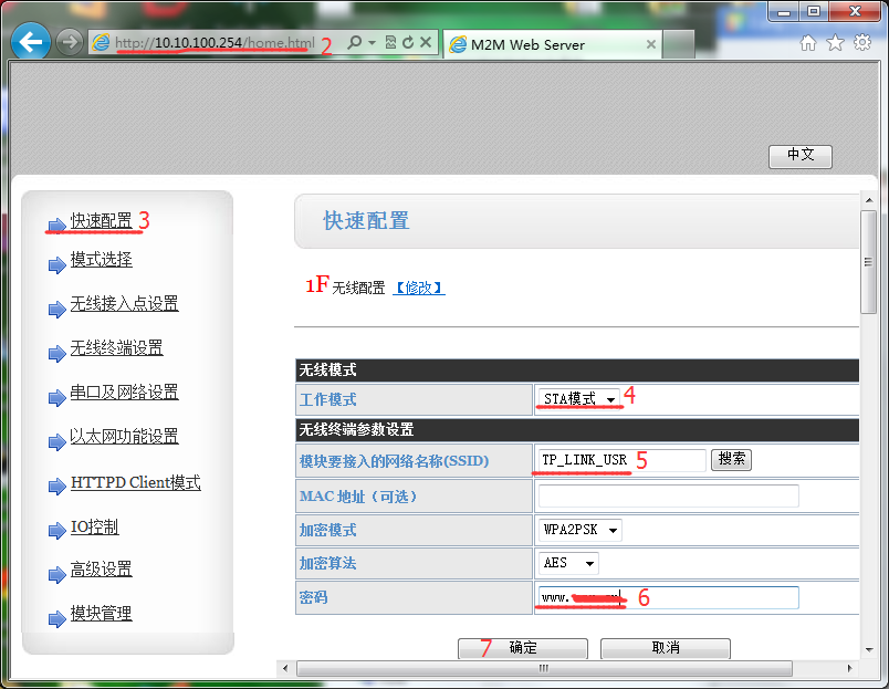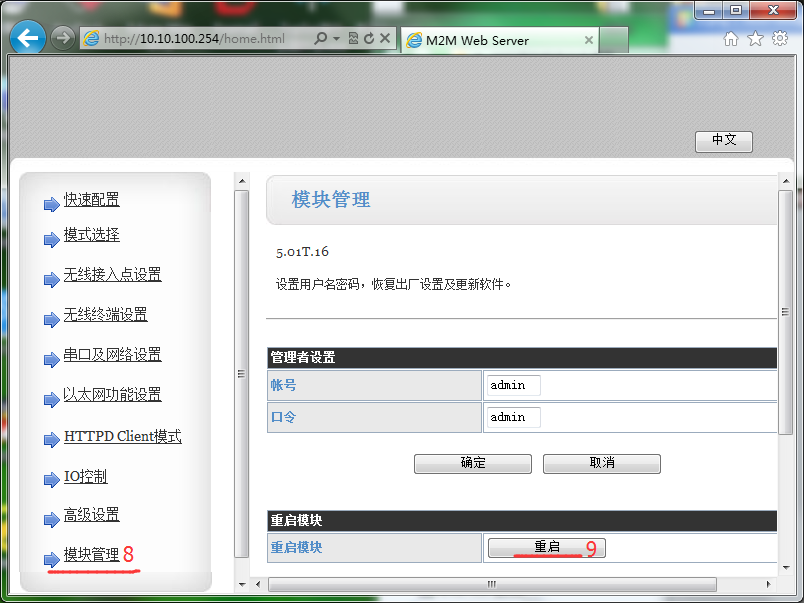 4.打開瀏覽器(建議使用IE瀏覽器),在地址欄中輸入10.10.100.254,賬戶密碼為admin。進(jìn)入到網(wǎng)頁,修改模塊參數(shù),使模塊連接到路由器AP中。