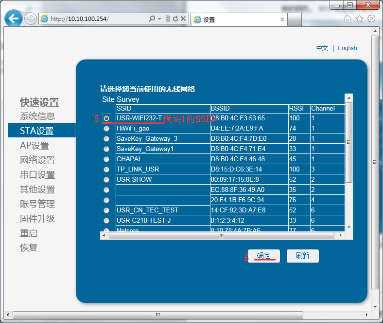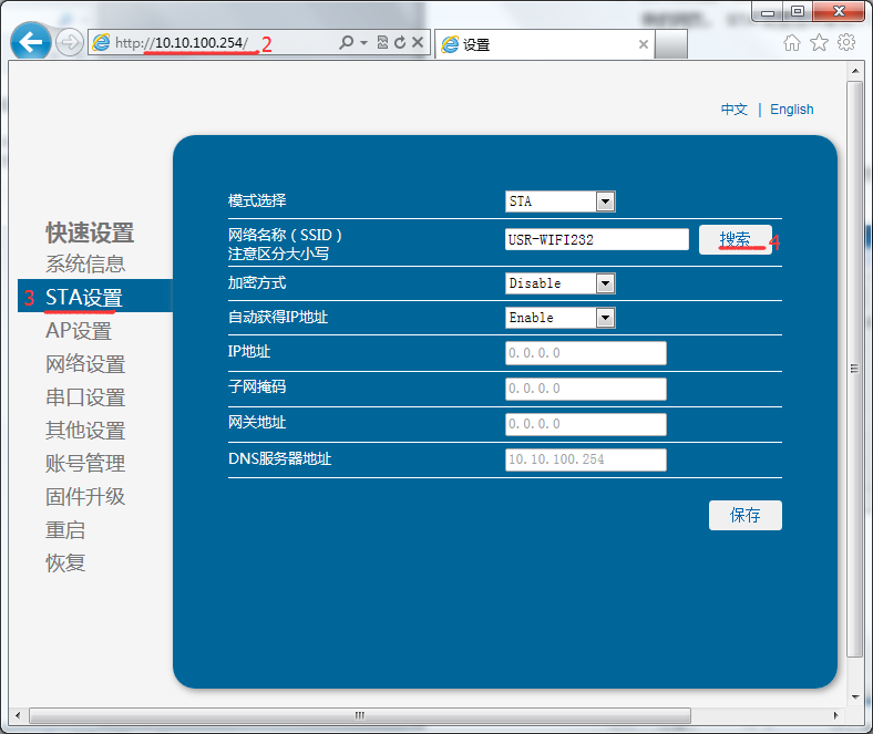 b.打開瀏覽器(推薦使用IE),輸入10.10.100.254,賬戶密碼admin,進入模塊的網頁, STA設置選項做如下設置。