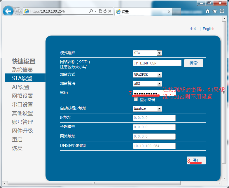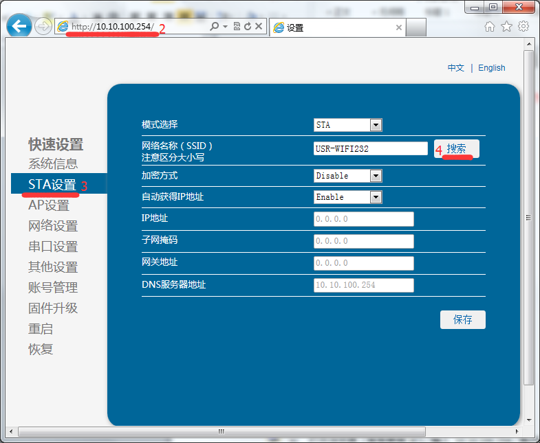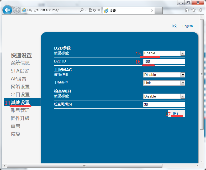 b)打開瀏覽器(推薦使用IE),輸入10.10.100.254,賬戶密碼為admin。進入模塊網頁之后,參數做如下設置。