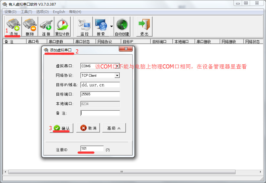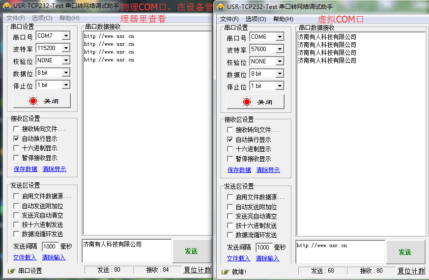 1. COM7為物理COM口,在電腦的設備管理器里可查看。COM6為虛擬串口軟件虛擬COM口。