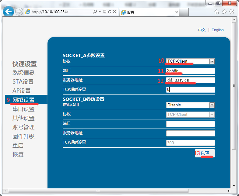 c)將模塊工作方式改為TCP Client,服務器地址dd.usr.cn,服務器端口25565。