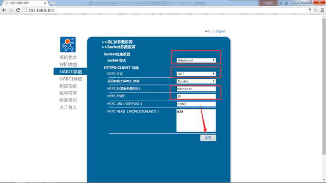 5、模塊設(shè)置參數(shù):登錄設(shè)置網(wǎng)頁(yè),模塊設(shè)置為Httpd Client模式,請(qǐng)求方式,設(shè)置服務(wù)器地址,端口,保存。重啟模塊。(本說(shuō)明文檔使用為有人測(cè)試服務(wù)器)