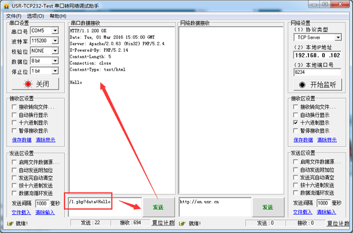 6、將WiFi模塊的串口連接到電腦串口,使用串口調(diào)試助手發(fā)送提交數(shù)據(jù)。使用GET需要在數(shù)據(jù)前面加上URL,返回ok表示測(cè)試成功。