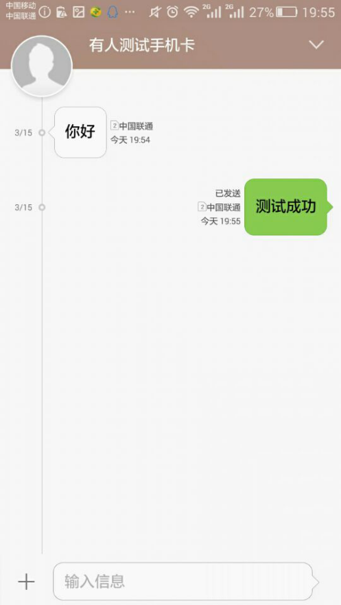 3、手機端接收GM3串口發送的數據:你好,手機短信發送:測試成功,在串口可以收到