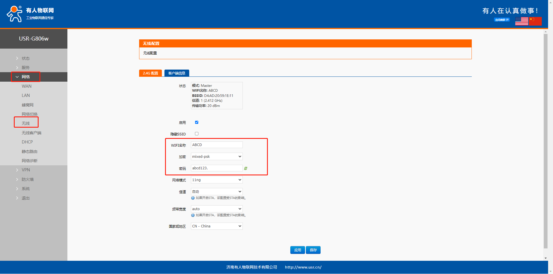USR-G806W產(chǎn)品修改WiFi名稱和密碼示例