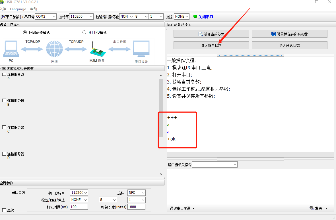 打開串口--->進(jìn)入配置狀態(tài)--->成功的話,會(huì)返回OK