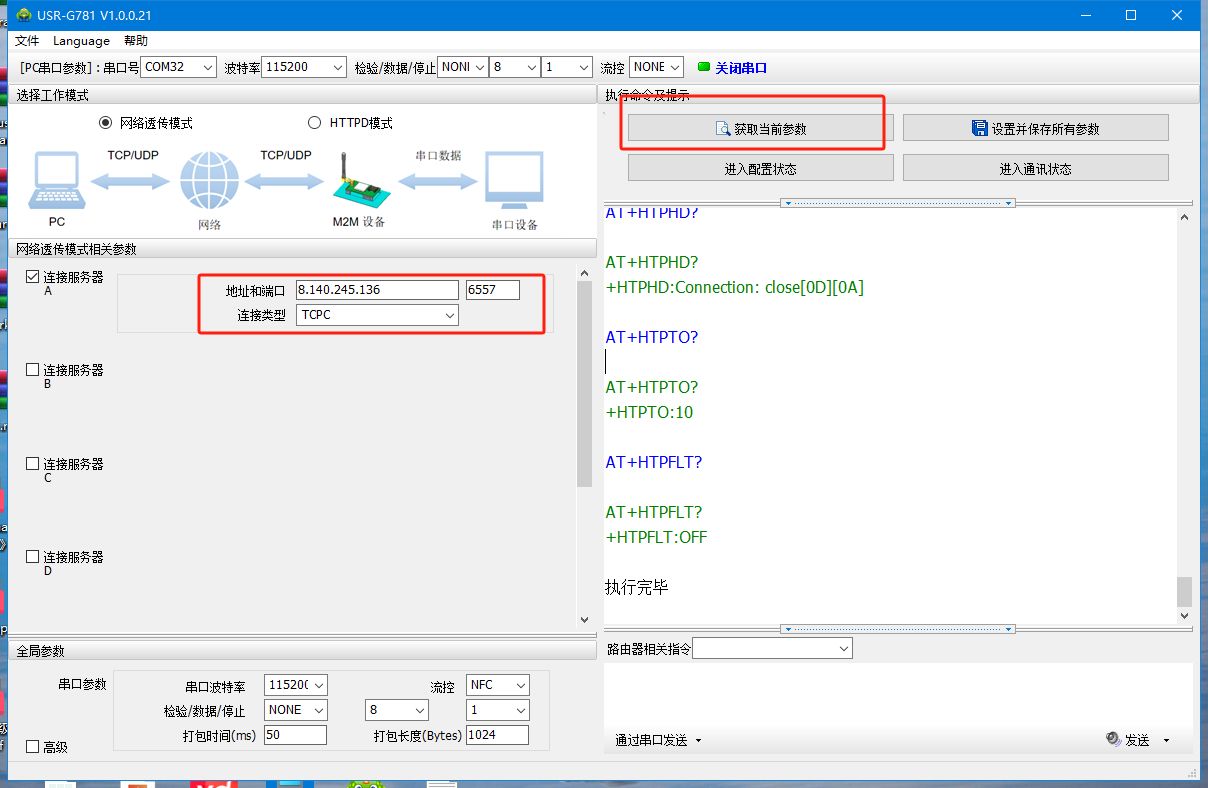 3、獲取當(dāng)前參數(shù)----設(shè)置工作模式為“網(wǎng)絡(luò)透?jìng)髂J健保斎脒h(yuǎn)程服務(wù)器的IP和端口。