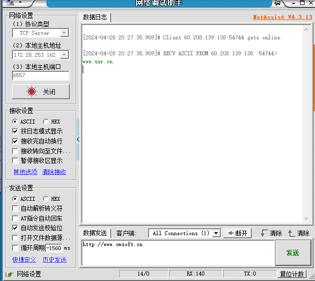 登陸遠(yuǎn)程桌面連接,打開一個(gè)網(wǎng)絡(luò)助手,協(xié)議類型TCP server,服務(wù)器IP,本地端口6557和USR-G781一樣,點(diǎn)擊連接。