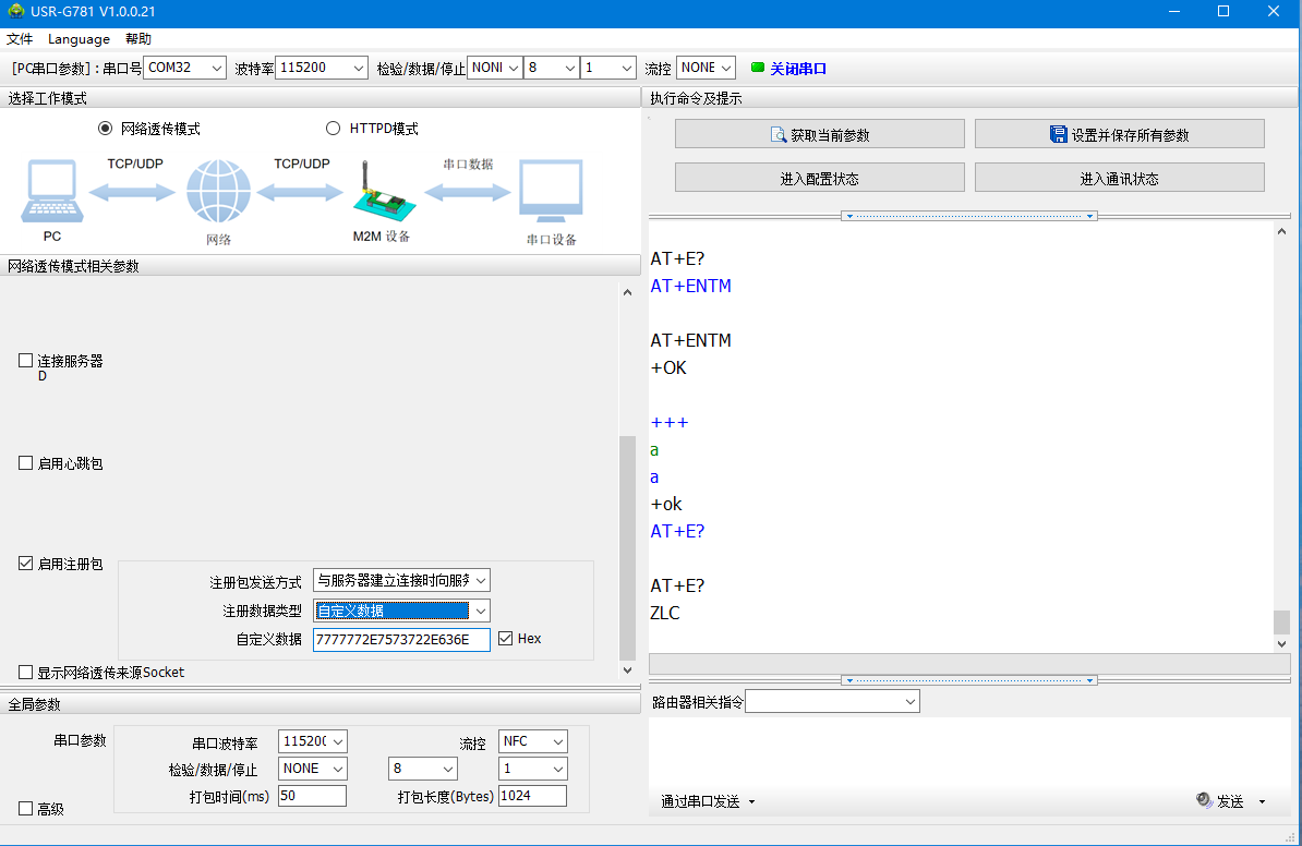 USR-G781連接遠(yuǎn)程服務(wù)器注冊(cè)包試示例