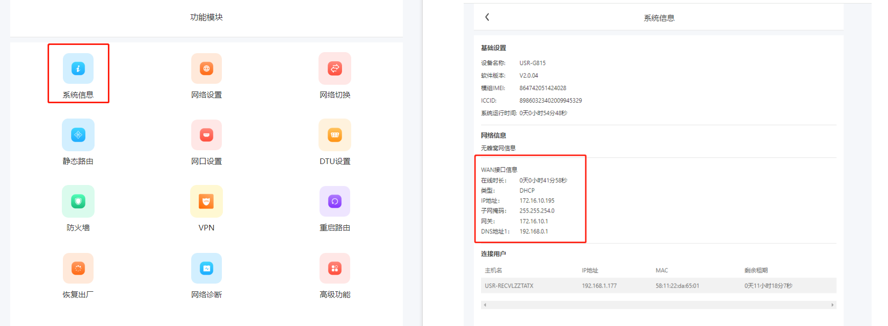 1、 首次使用 USR-G815 設備時,可以通過 PC 連接 USR-G815 的 LAN 口,自動獲取同網段的IP 192.168.1.X,瀏覽器輸入G815的LAN IP:192.168.1.1進入內置網頁。