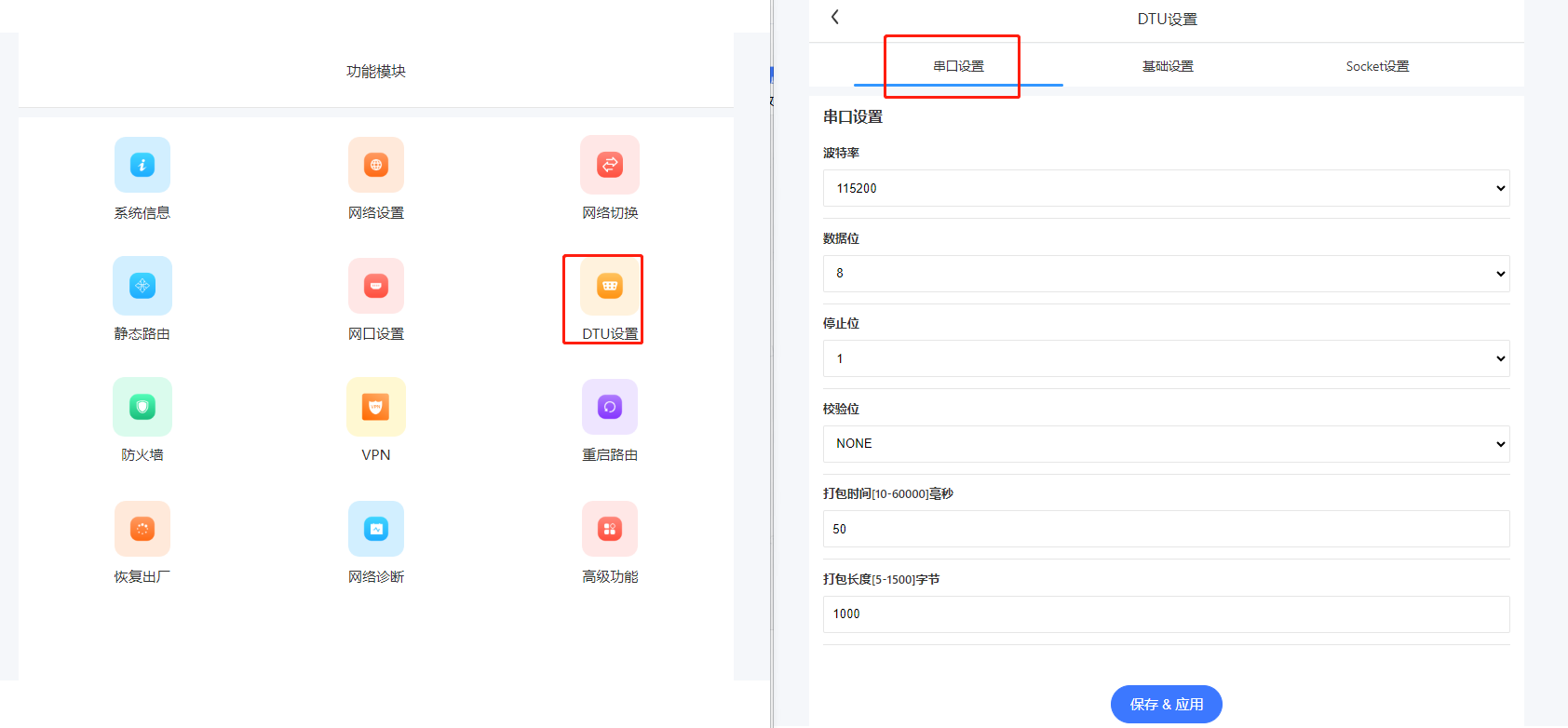 4、DTU配置界面--串口設置--配置G815的串口參數和串口要連接的真實終端設備的串口參數保持一致。本案例以默認為主。