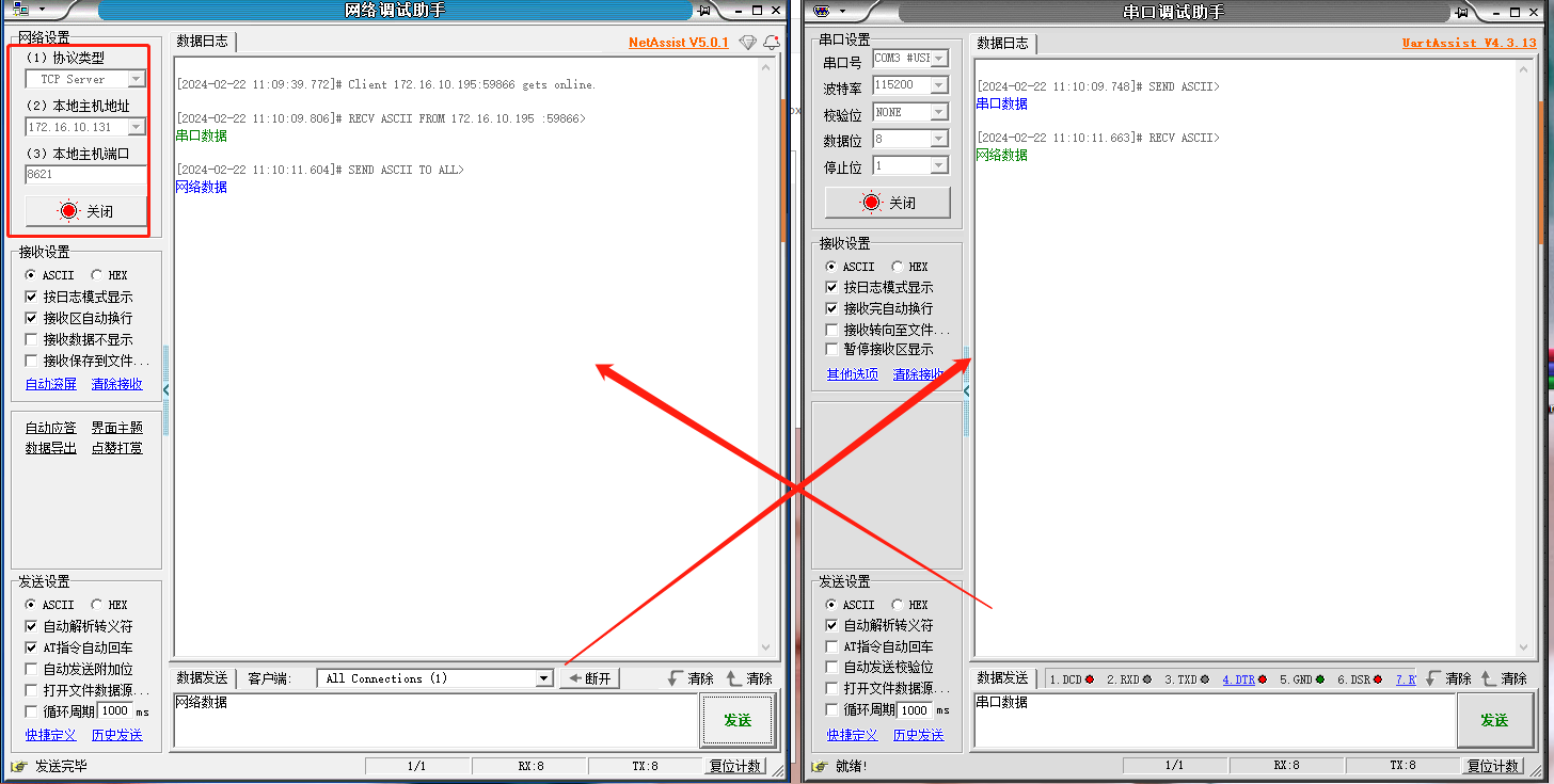 電腦上開一個網絡調試助手為server,本地IP:172.16.10.131本地端口為:8621