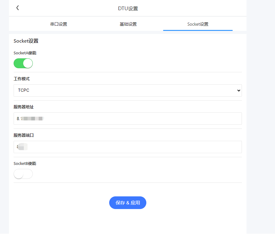 開啟socketA 使能,填寫要連接的遠(yuǎn)程服務(wù)器的IP和端口。