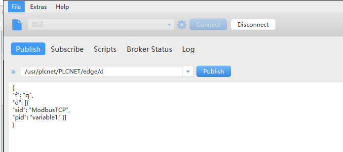 6、發(fā)布指定主題與內(nèi)容,設(shè)備回復(fù)對(duì)應(yīng)數(shù)據(jù)(sid:有人云模板中從機(jī)名稱;pid:添加變量點(diǎn)時(shí)配置的變量標(biāo)識(shí)符)