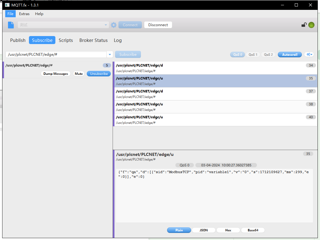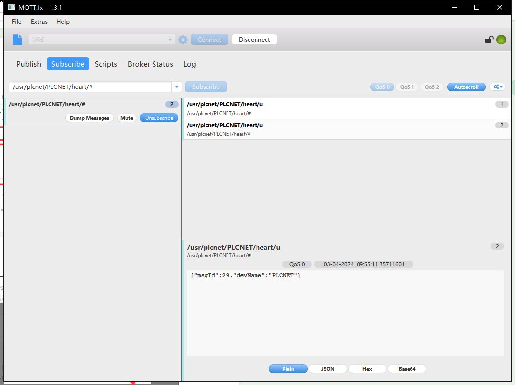 5、打開服務(wù)器,訂閱心跳包主題/usr/plcnet/(devname)/heart/# 收到心跳數(shù)據(jù)表示與服務(wù)器連接成功