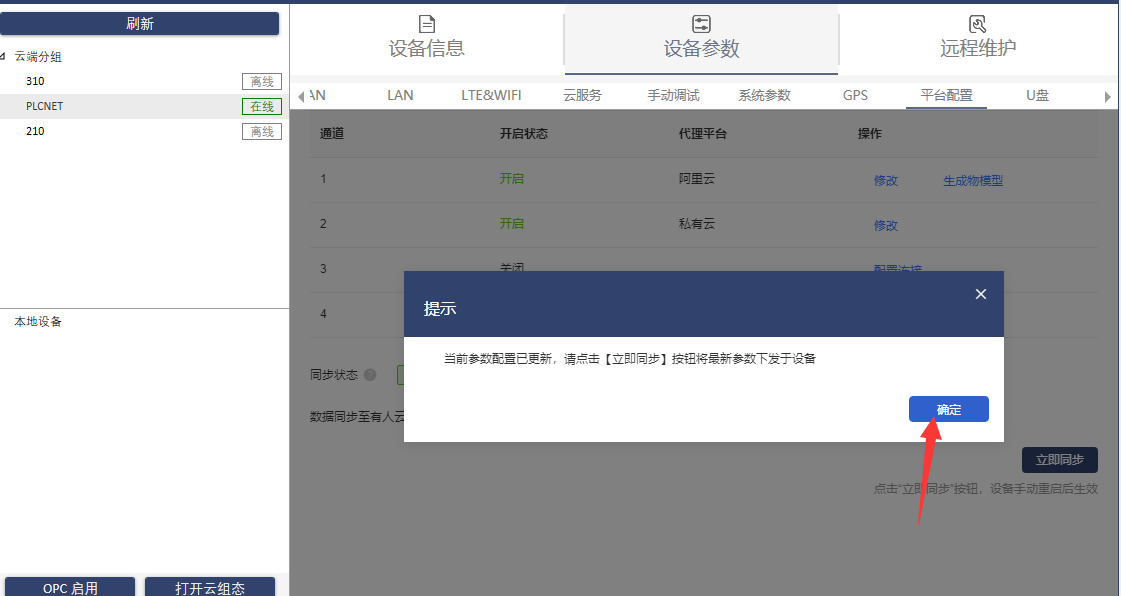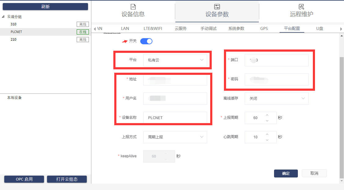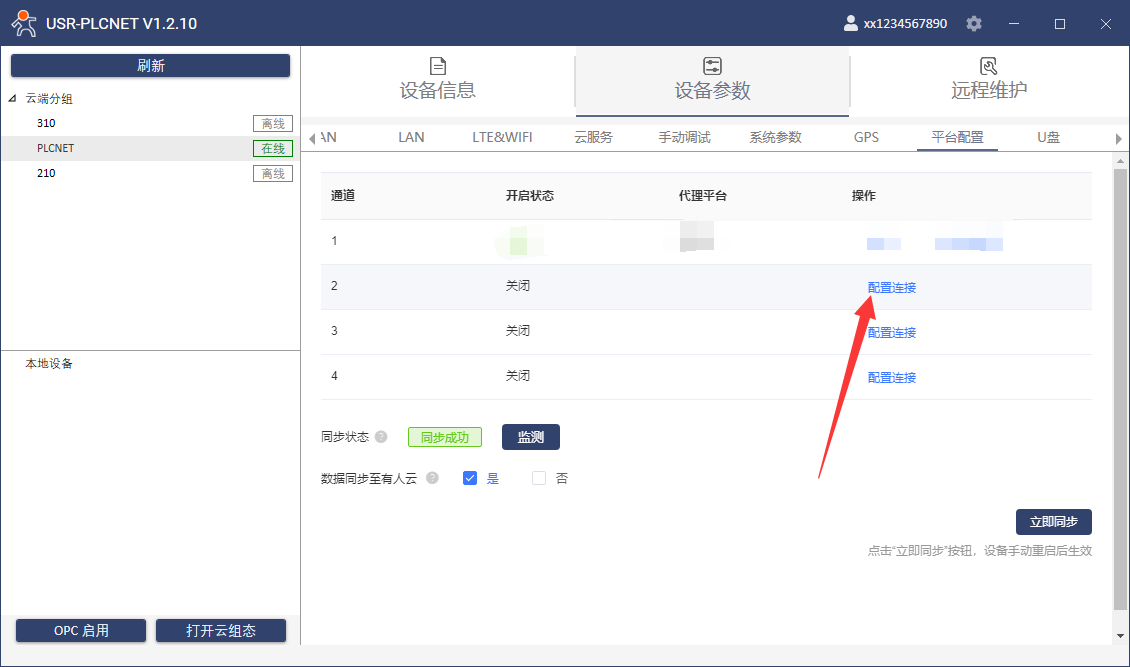1、打開配置軟件,點(diǎn)擊設(shè)備,選擇設(shè)備參數(shù)-平臺(tái)配置頁面,配置連接