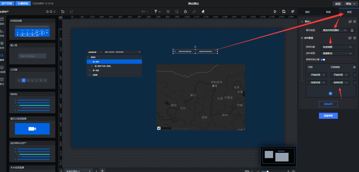 7、點擊時間選擇器配置交互,更改時間范圍時控制軌跡地圖的數據聯動,字段與映射配置開始時間與結束時間
