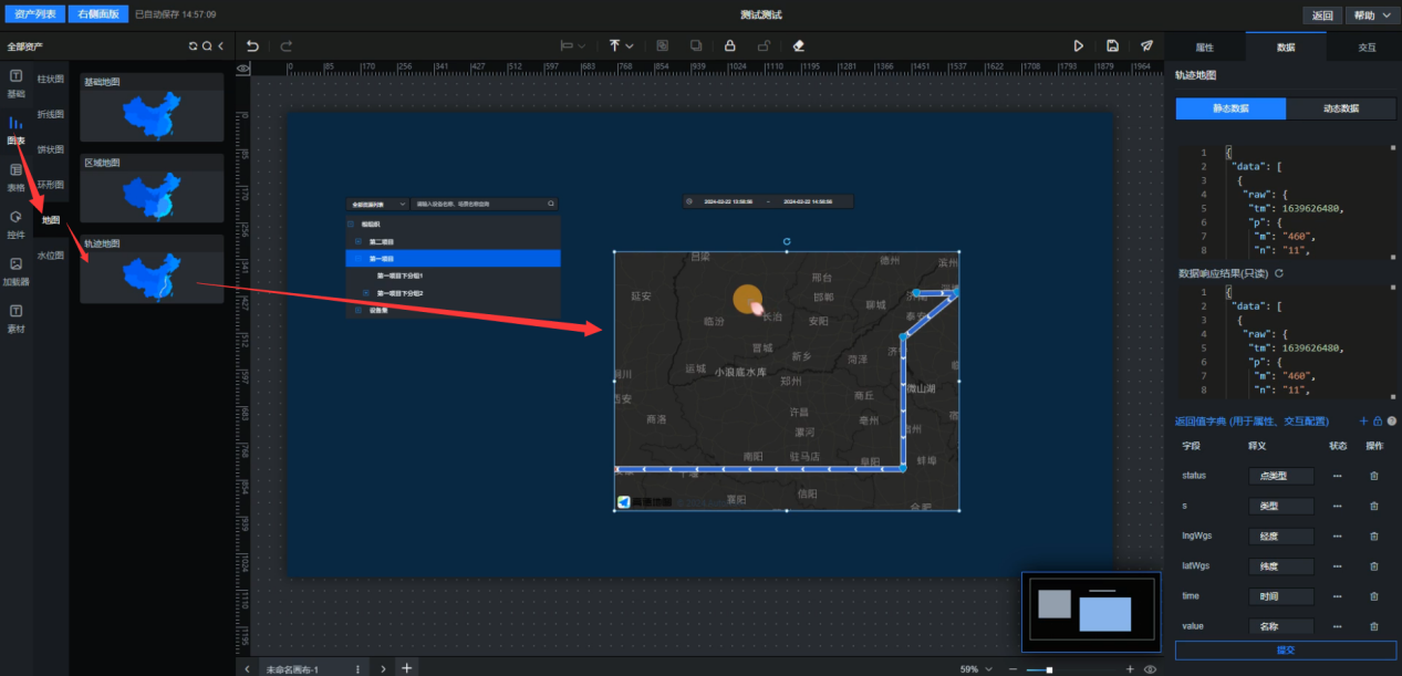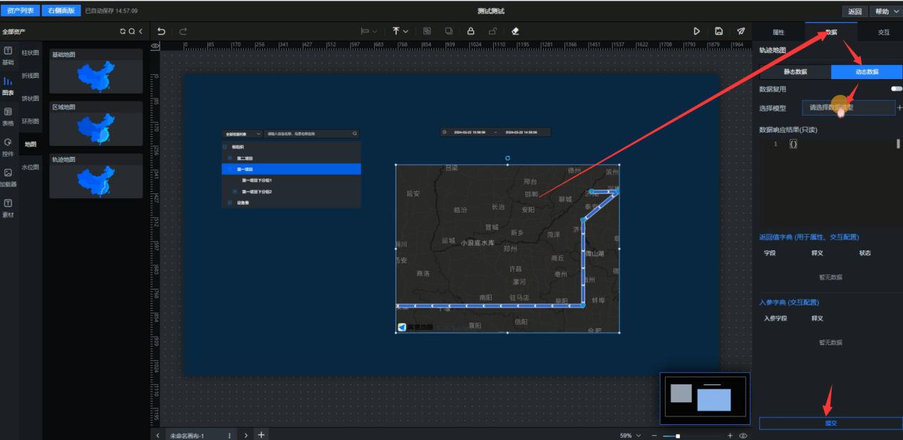 4、點擊地圖,在數據中綁定動態數據,選擇“單個設備的歷史軌跡”數據模型