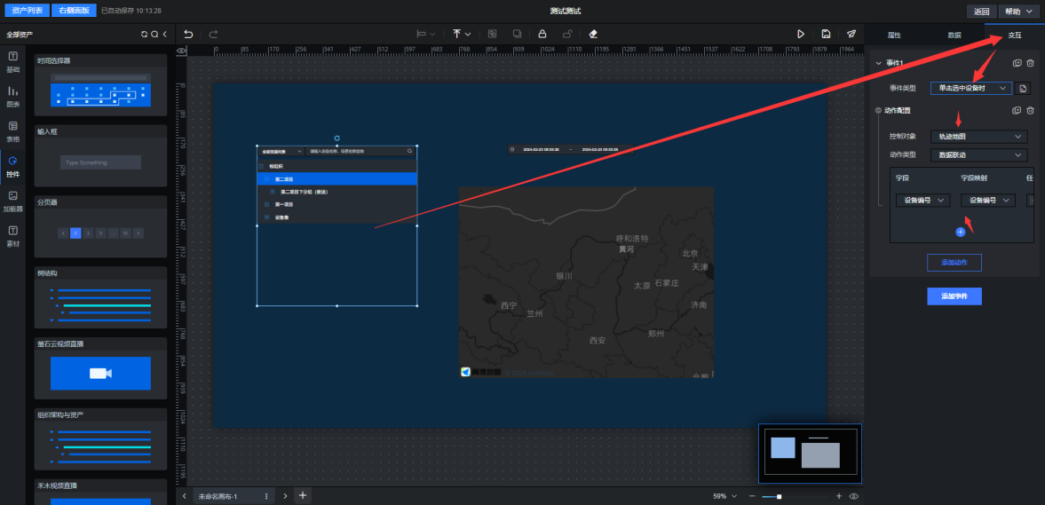 6、點擊組織結構資產下拉框配置交互,單擊選中設備時控制軌跡地圖的數據聯動,字段與映射都是設備編號