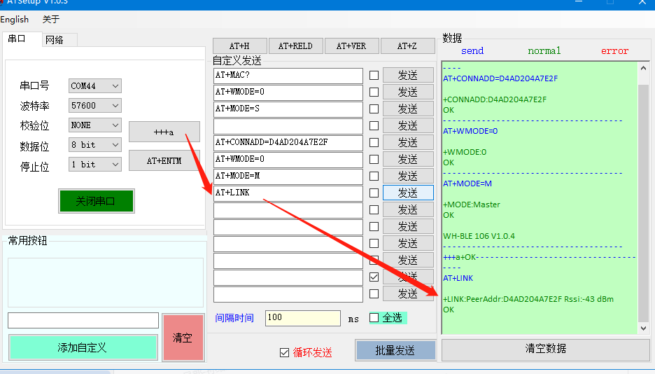 軟件串口打開另一塊BLE106 com口:波特率 57600、無校驗(yàn)、8 位數(shù)據(jù)位、1 位停止位。