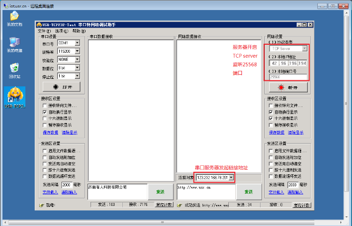 2.2:服務器打開網絡調試助手軟件,設置網絡協議為TCP 服務端。監聽本地端口25568.GPRS模塊主動向服務器發起鏈接,可以在連接對象看到模塊發起的鏈接地址。
