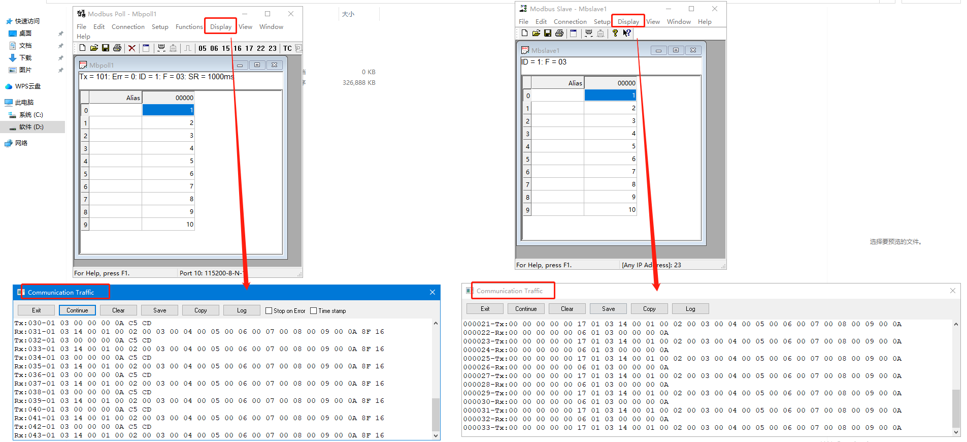 2、數據監控,MODBUS POLL和MODBUS SLAVE,都點擊Display,找到Communication Traffic,點開就可以看到后臺數據。