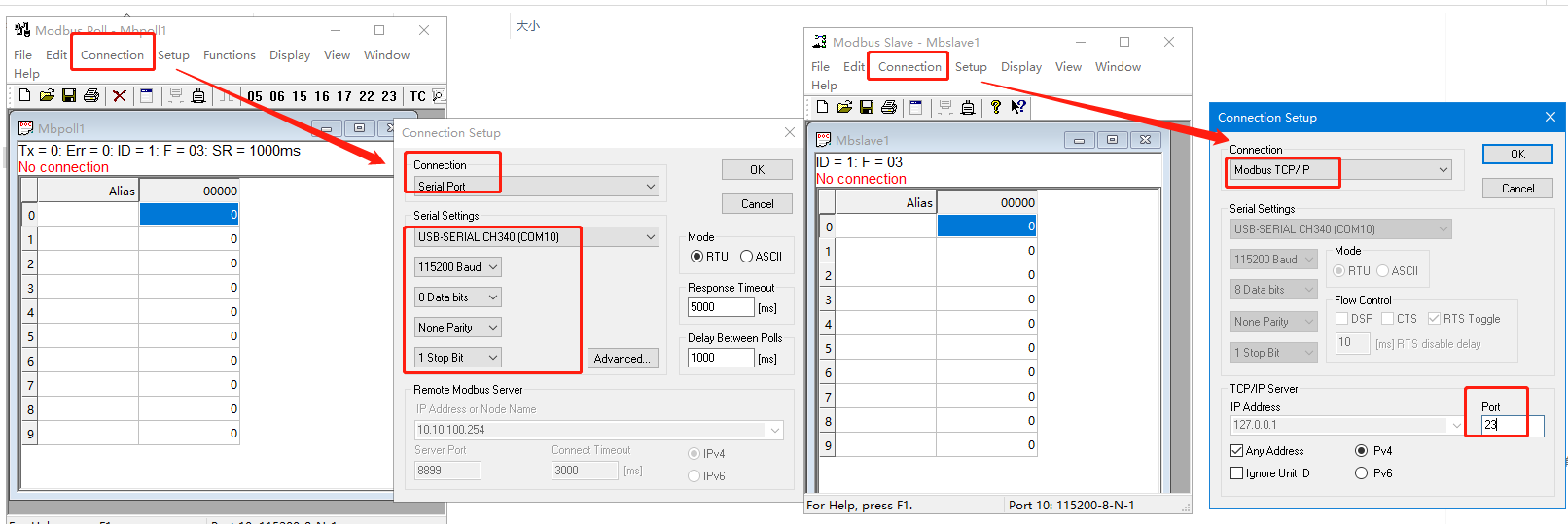 (1)Modbus Poll軟件,點擊Connection,選擇Serial Port,選擇對應的COM口COM10,對應USR-TCP232-E2的串口參數115200,最后點擊OK。