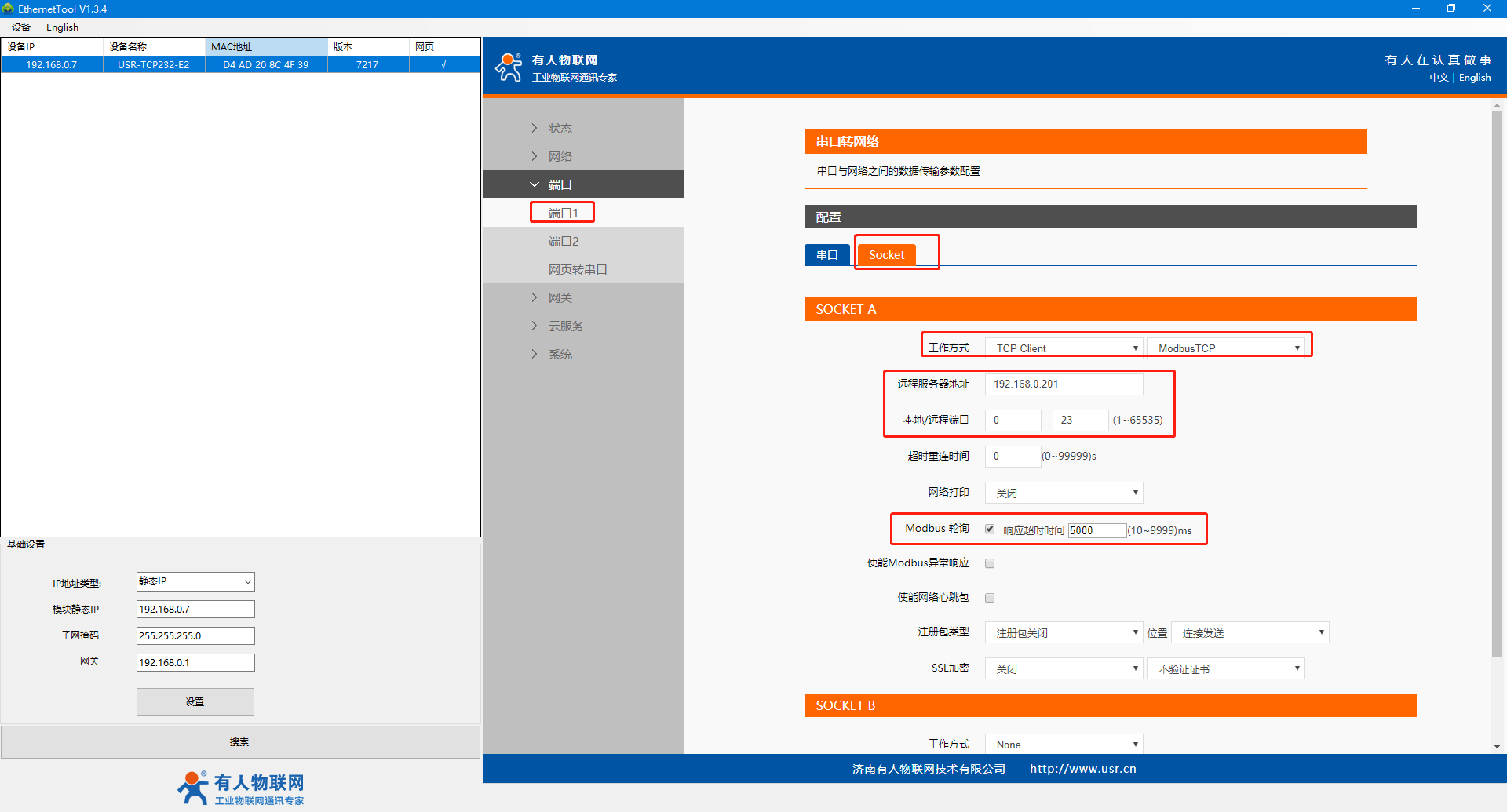 USR-TCP232-E2串口做主機MODBUS網關功能示例