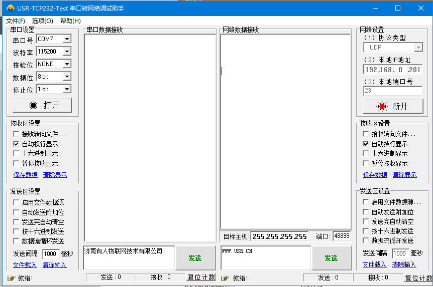 2、打開(kāi)網(wǎng)絡(luò)助手,建立UDP連接,本地IP填電腦IP 192.168.0.201 本地端口號(hào)填23