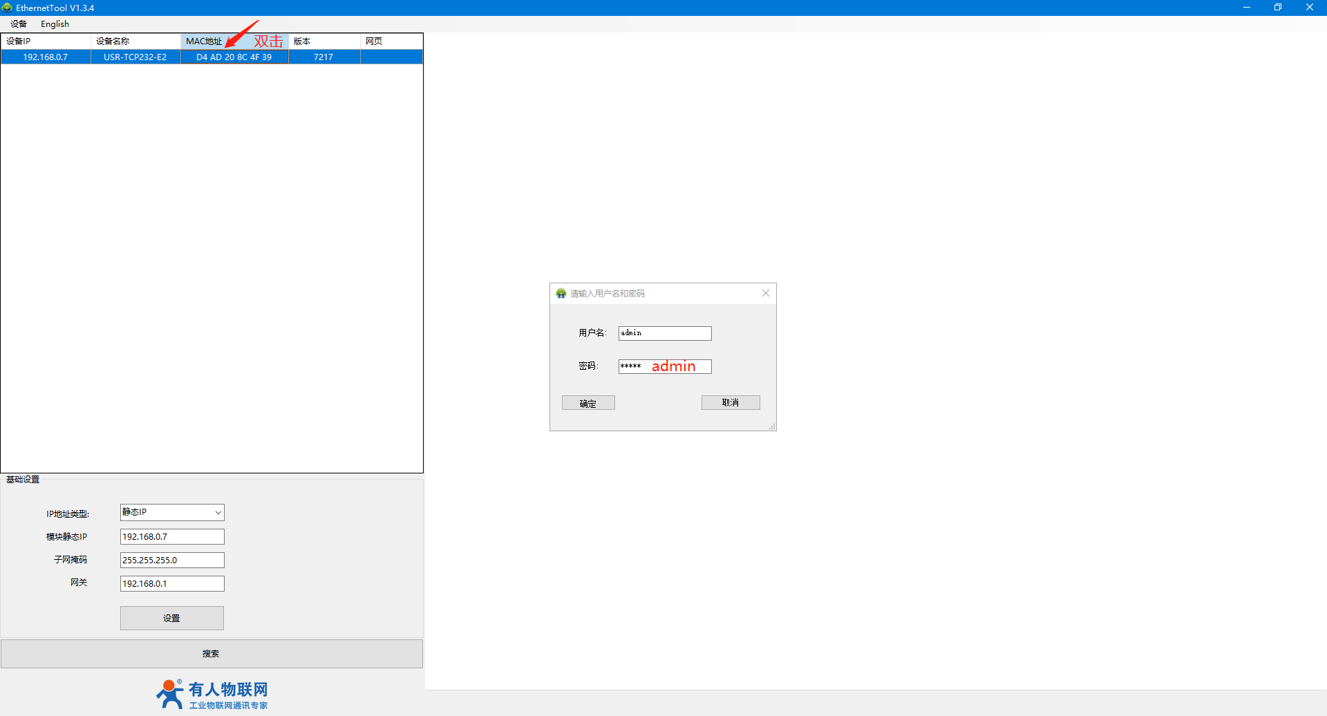 USR-TCP232-E2和電腦網(wǎng)線直連,打開(kāi)H7軟件,搜到USR-TCP232-E2的IP。