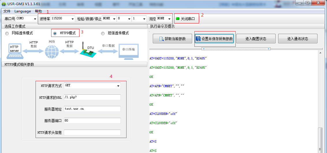 5、模塊設置參數:打開設置軟件,模塊設置為Httpd Client模式,請求方式GET,URL為/1.php?,設置服務器地址test.usr.cn,端口80,設置并保存所有參數,重啟模塊。(本說明文檔使用為有人測試服務器)