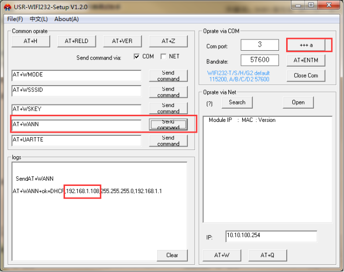3、串口發送AT指令獲取模塊IP。
