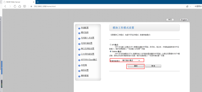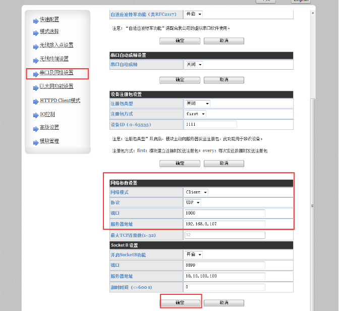 4、登錄設置網頁,設置為串口指令模式,點擊確定;串口及網絡設置,設置成UDP Client,目標IP192.168.0.107,目標端口1000。模塊管理,重啟。