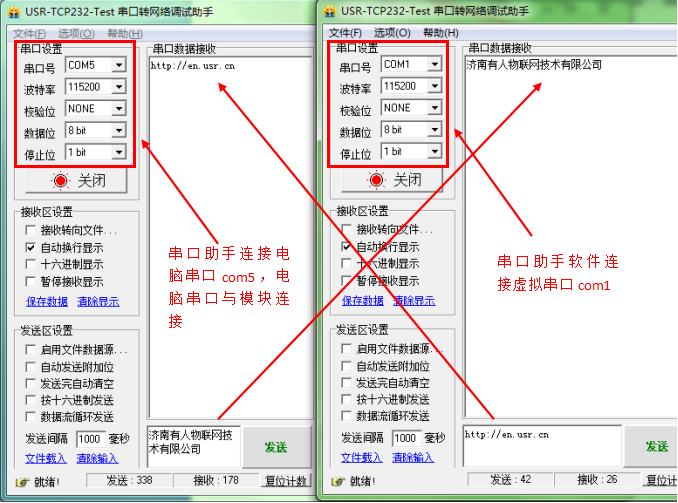 打開兩個串口調試助手軟件,一個連接電腦串口com5,一個連接虛擬串口com1.實現兩個串口直接數據互發。