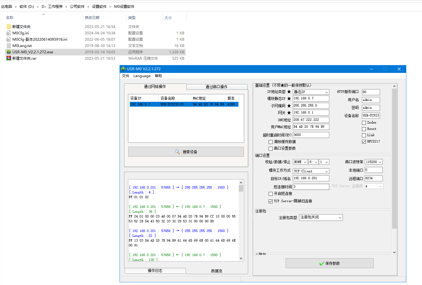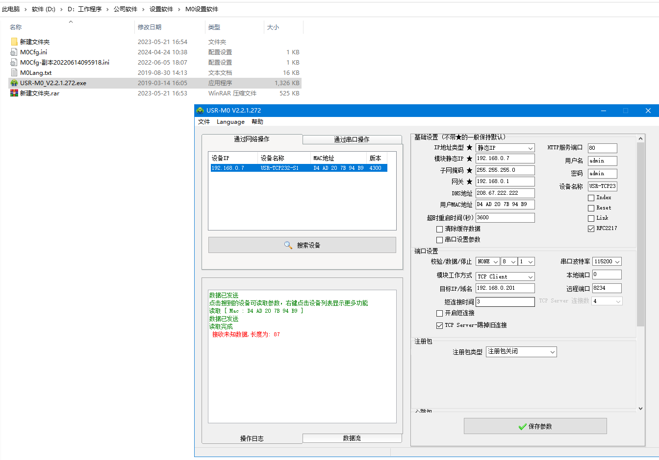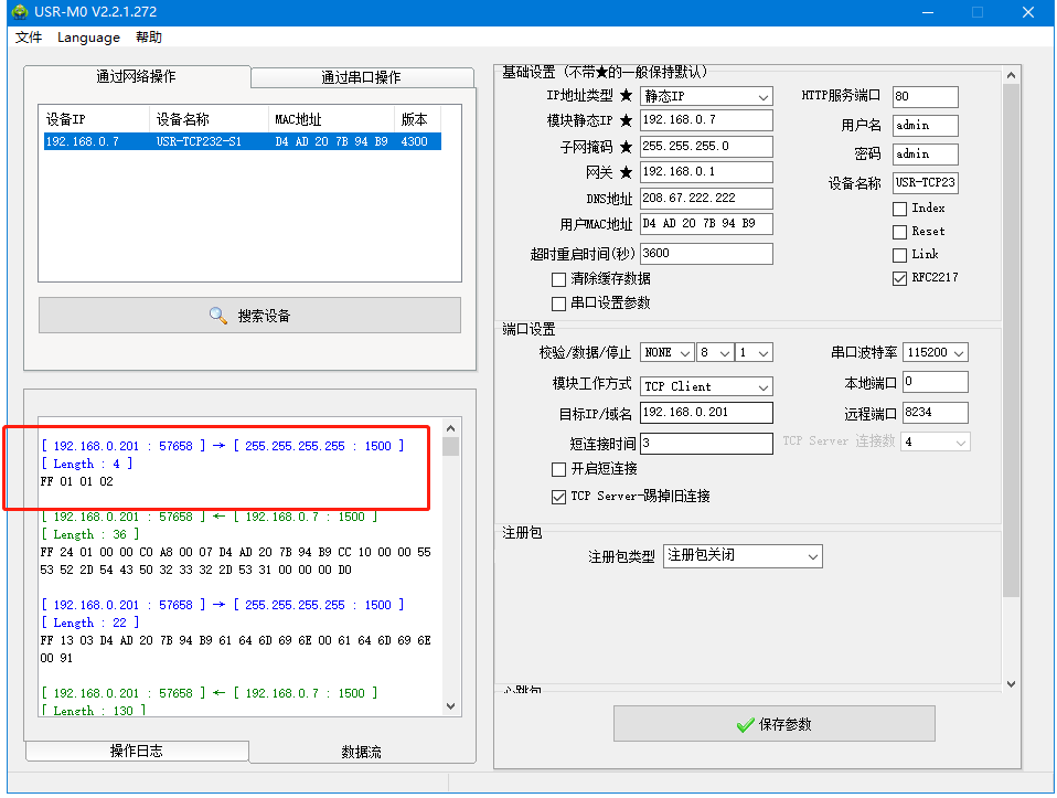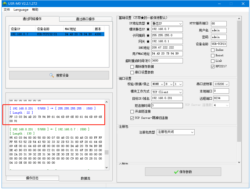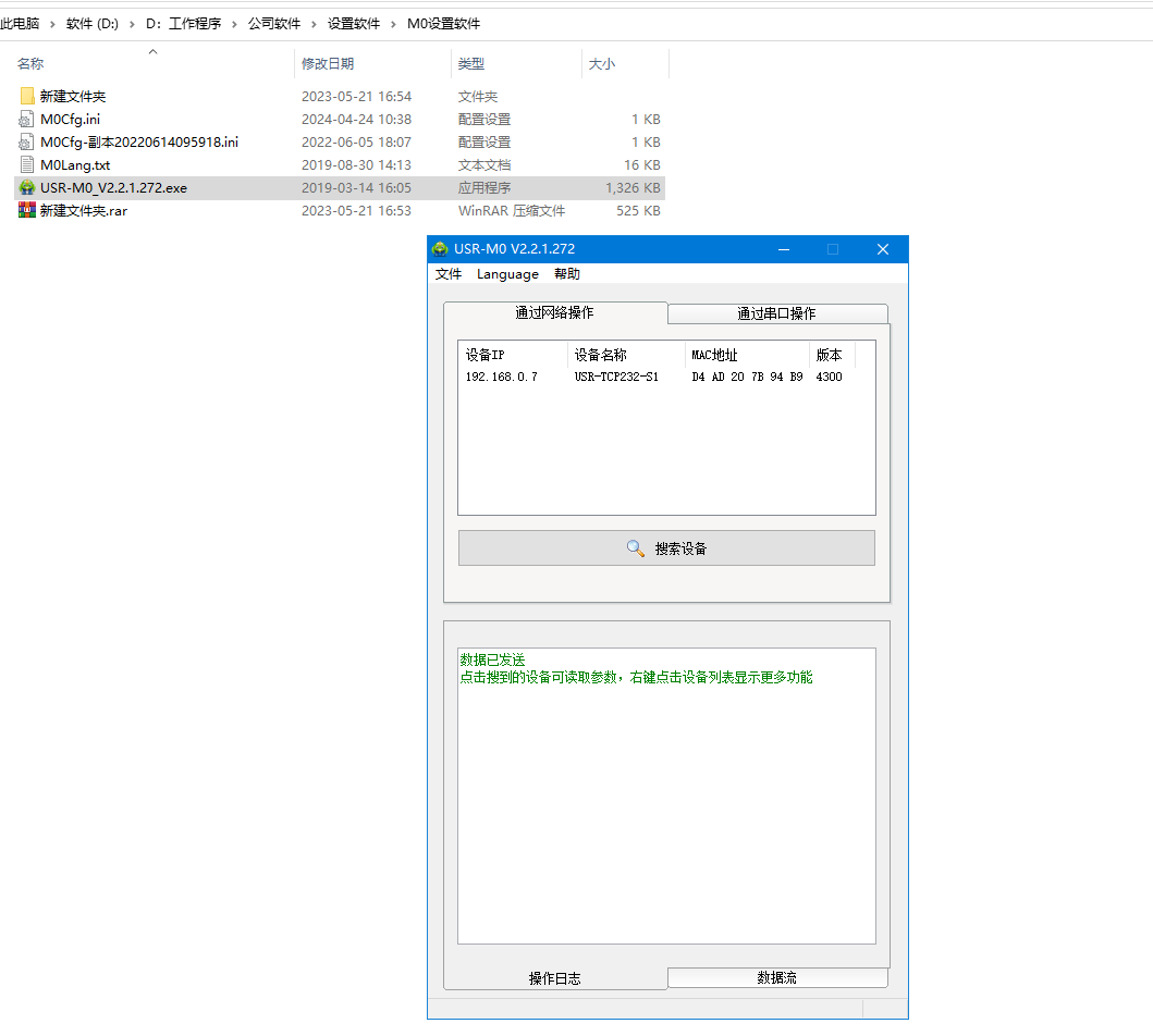 USR-TCP232-S1和電腦網線直連,打開M0軟件,搜到USR-TCP232-S1的IP。