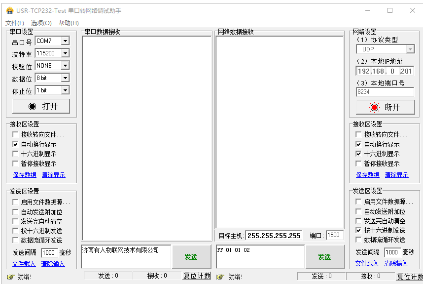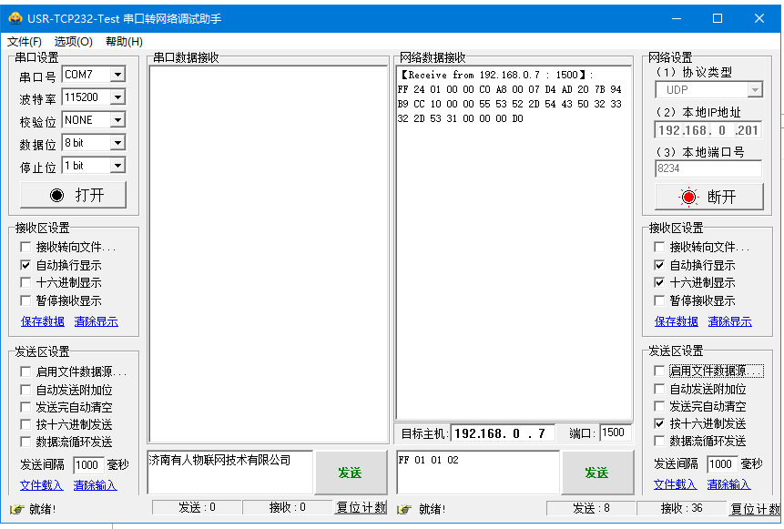 2、網絡端勾選按十六進制發送,輸入搜索指令,FF 01 01 02