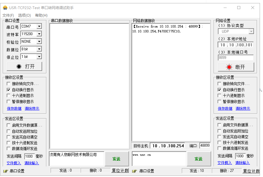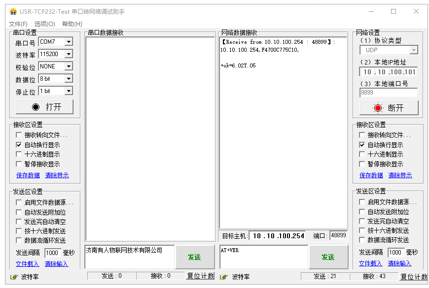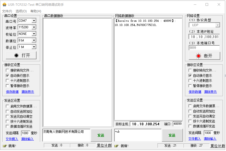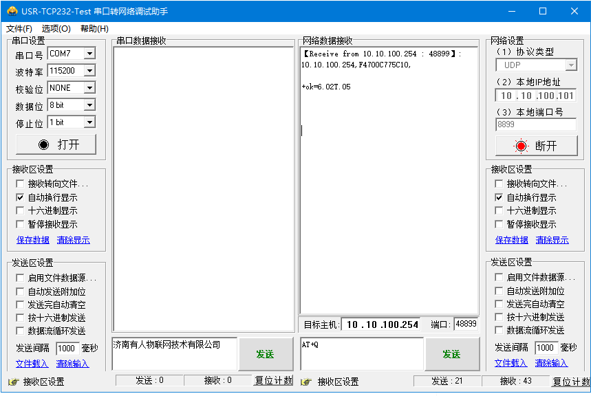 網絡數據接收到USR--WIFI232-A2的IP和MAC,收到IP和MAC后,立刻發送+ok(不帶回車發送),發送完就是進入網絡AT指令,可以發送USR--WIFI232-A2的AT指令,去查詢參數。