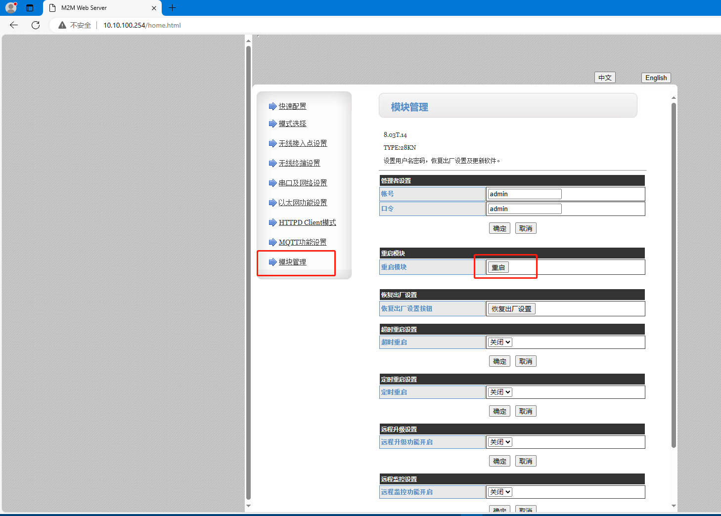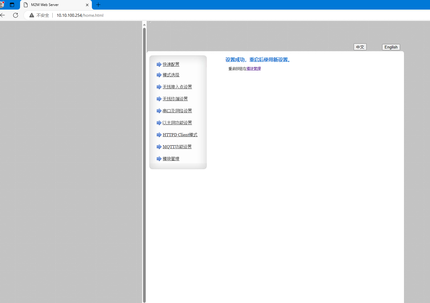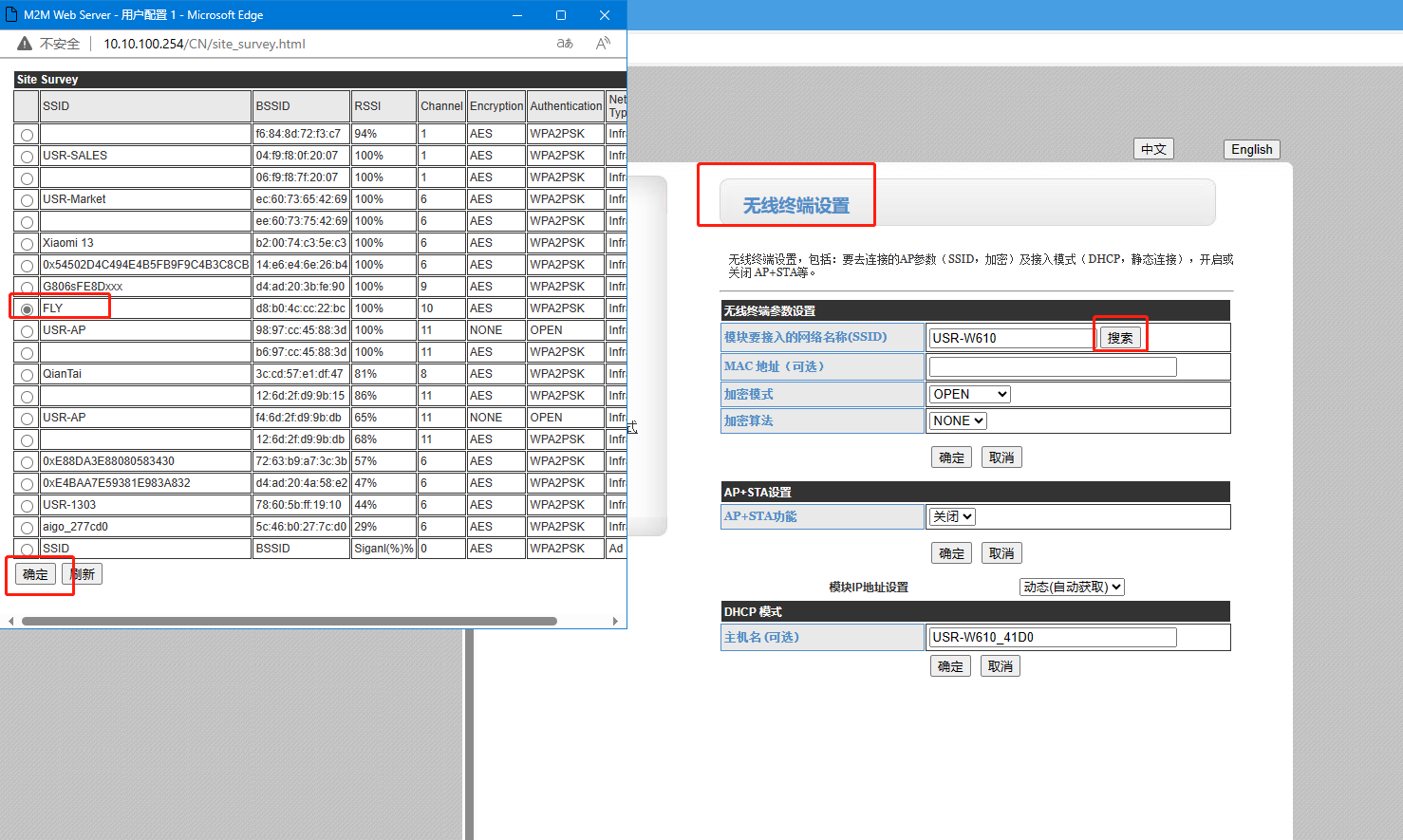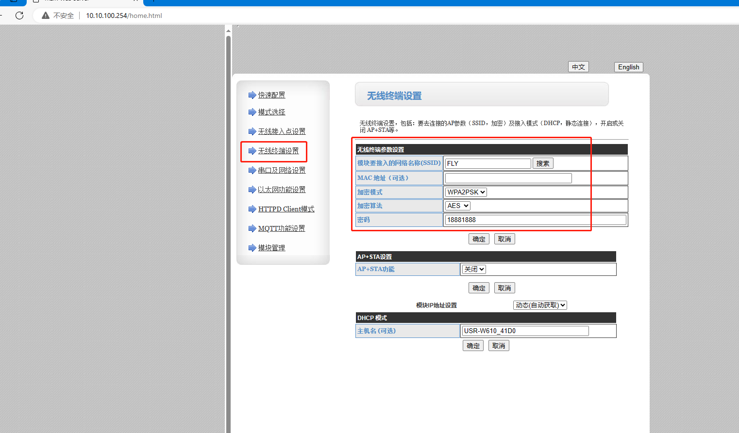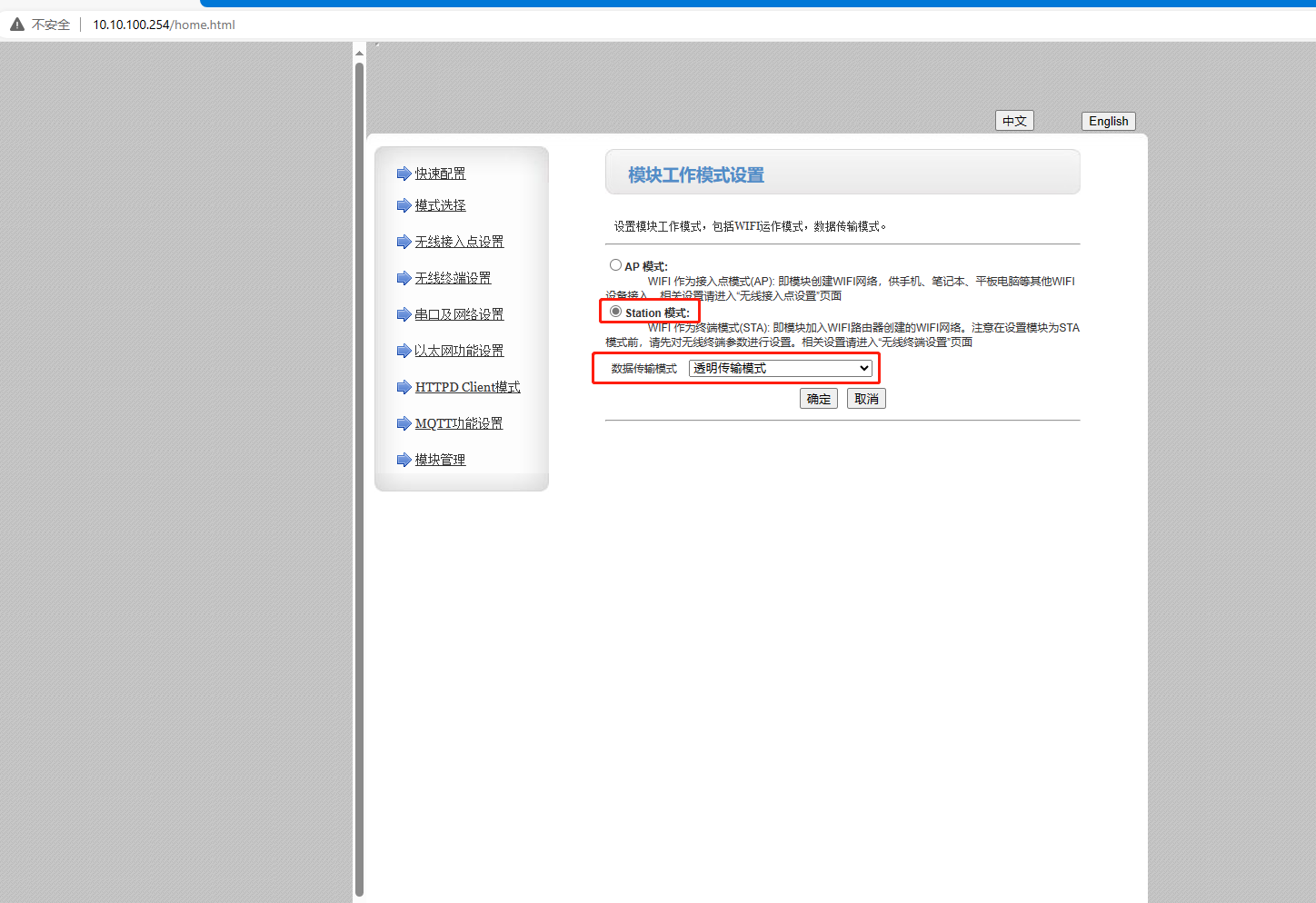 電腦連接W610的WiFi,瀏覽器輸入10.10.100.254登陸W610網頁,將工作模式設置STA,透明傳輸模式,點擊確定。