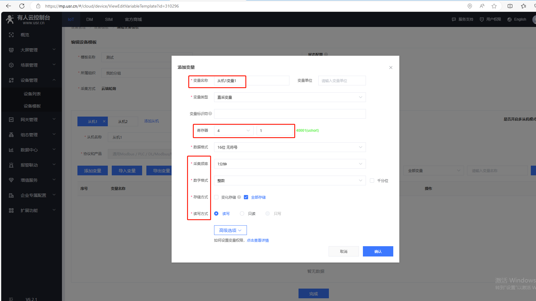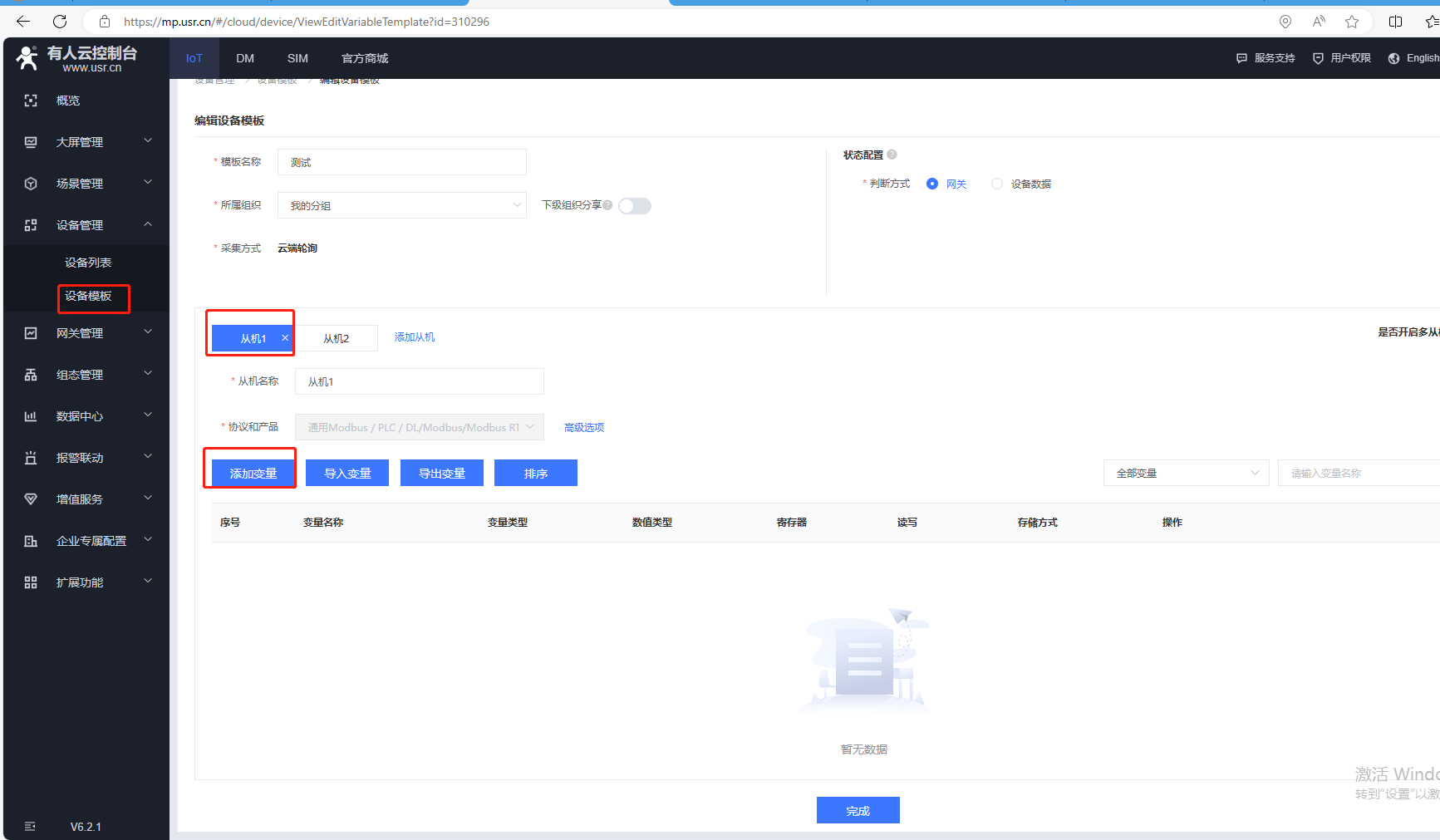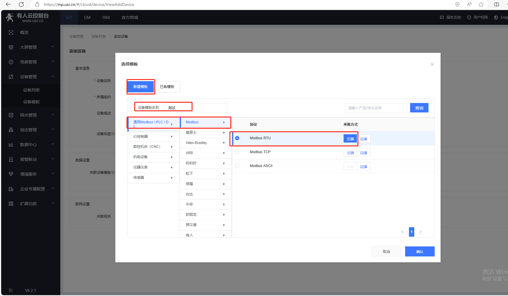 (2)點擊選擇模板,選擇新建模板,輸入設備模板名稱,通用Modbus/PLC/DL,選擇Modbus,協議選擇Modbus Rtu,采集方式云端,最后確認。