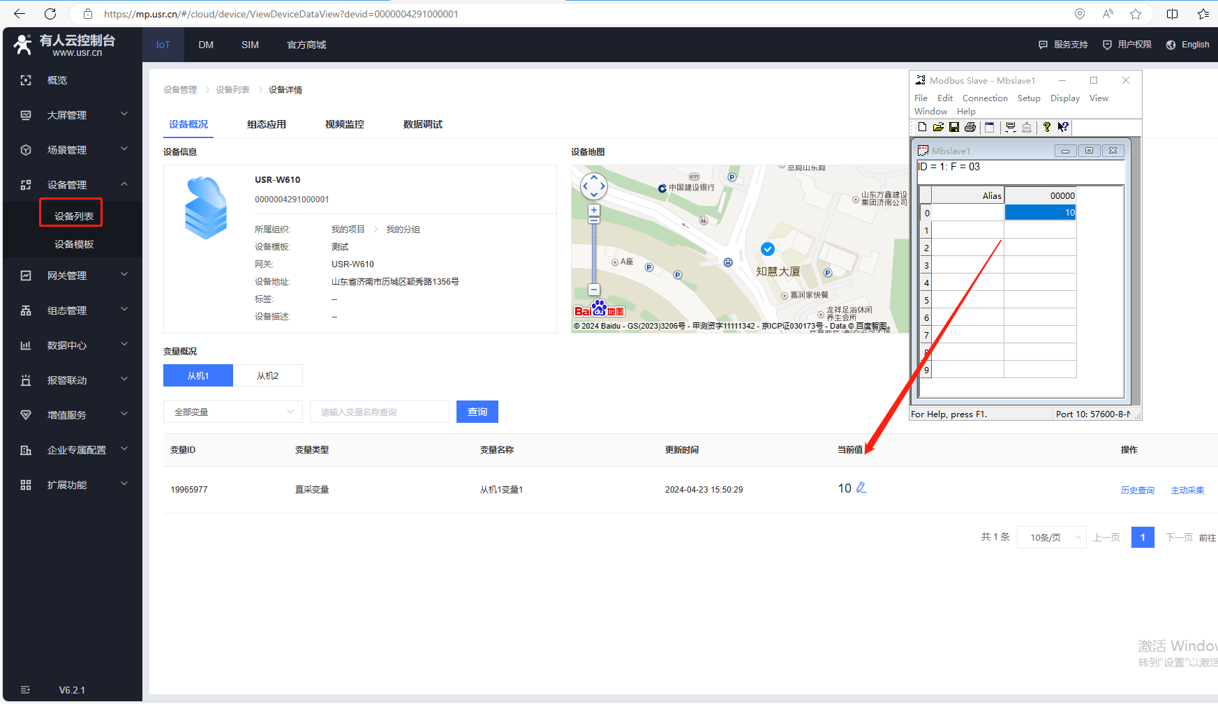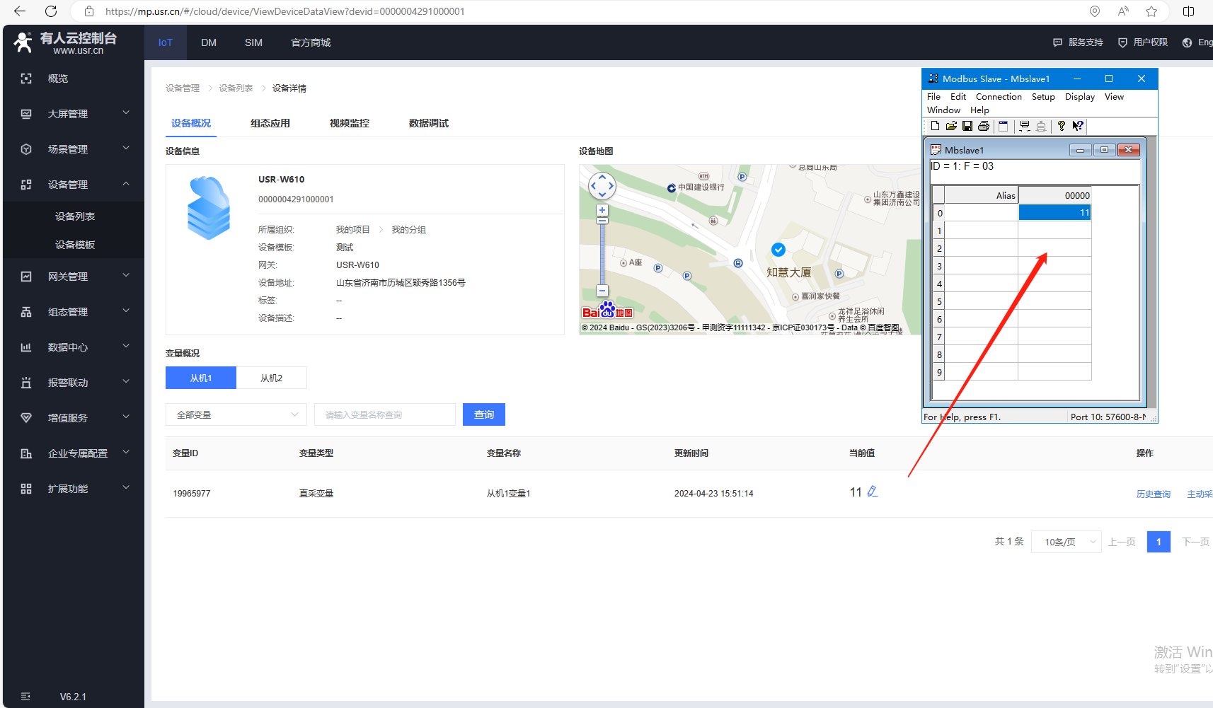 改變MODBUS SLAVE軟件的寄存器地址數據。COM10接的從機1,寄存器輸入10,有人云1分鐘采集數據10,有人云寫數據11,對應MODBUS SLAVE串口寄存器顯示數據11。