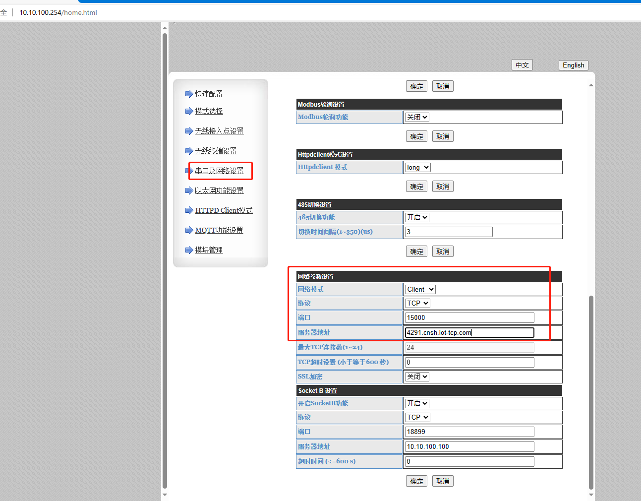 遠程服務器地址:4291.cnsh.iot-tcp.com 遠程端口:15000,點擊確定