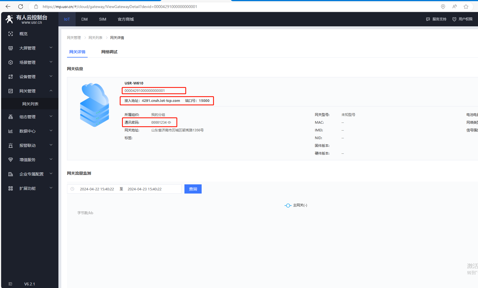 云平臺接入地址為: 4291.cnsh.iot-tcp.com; 端口號: 15000;
