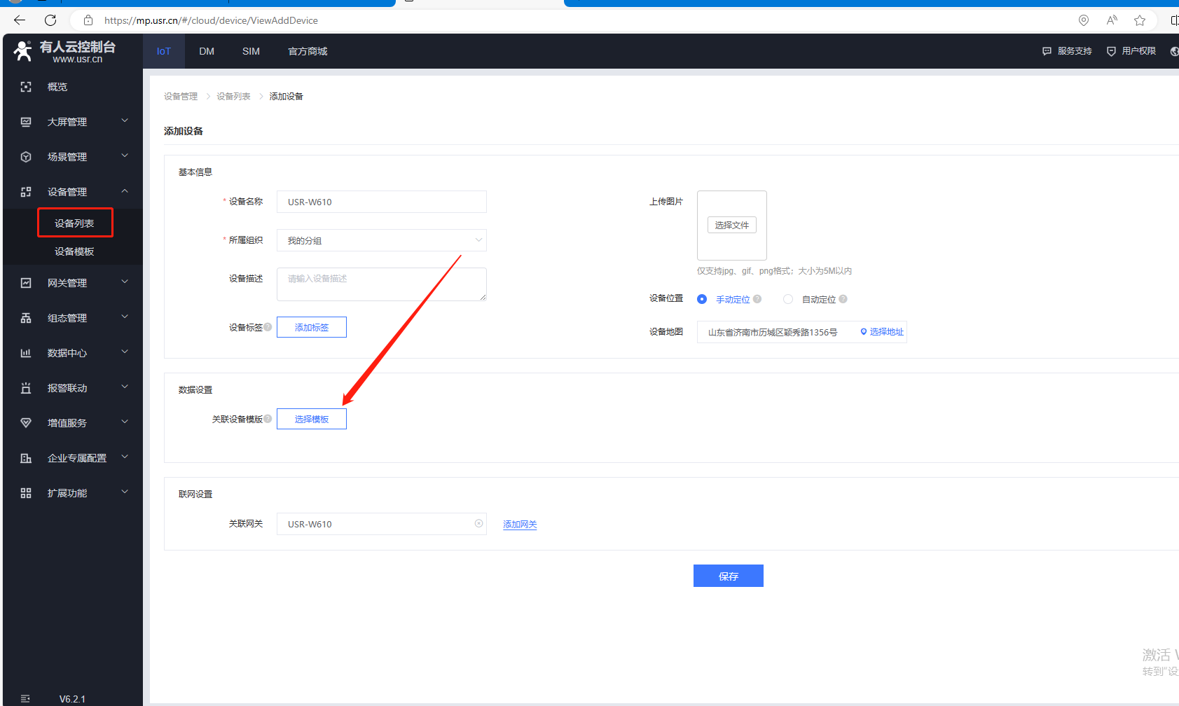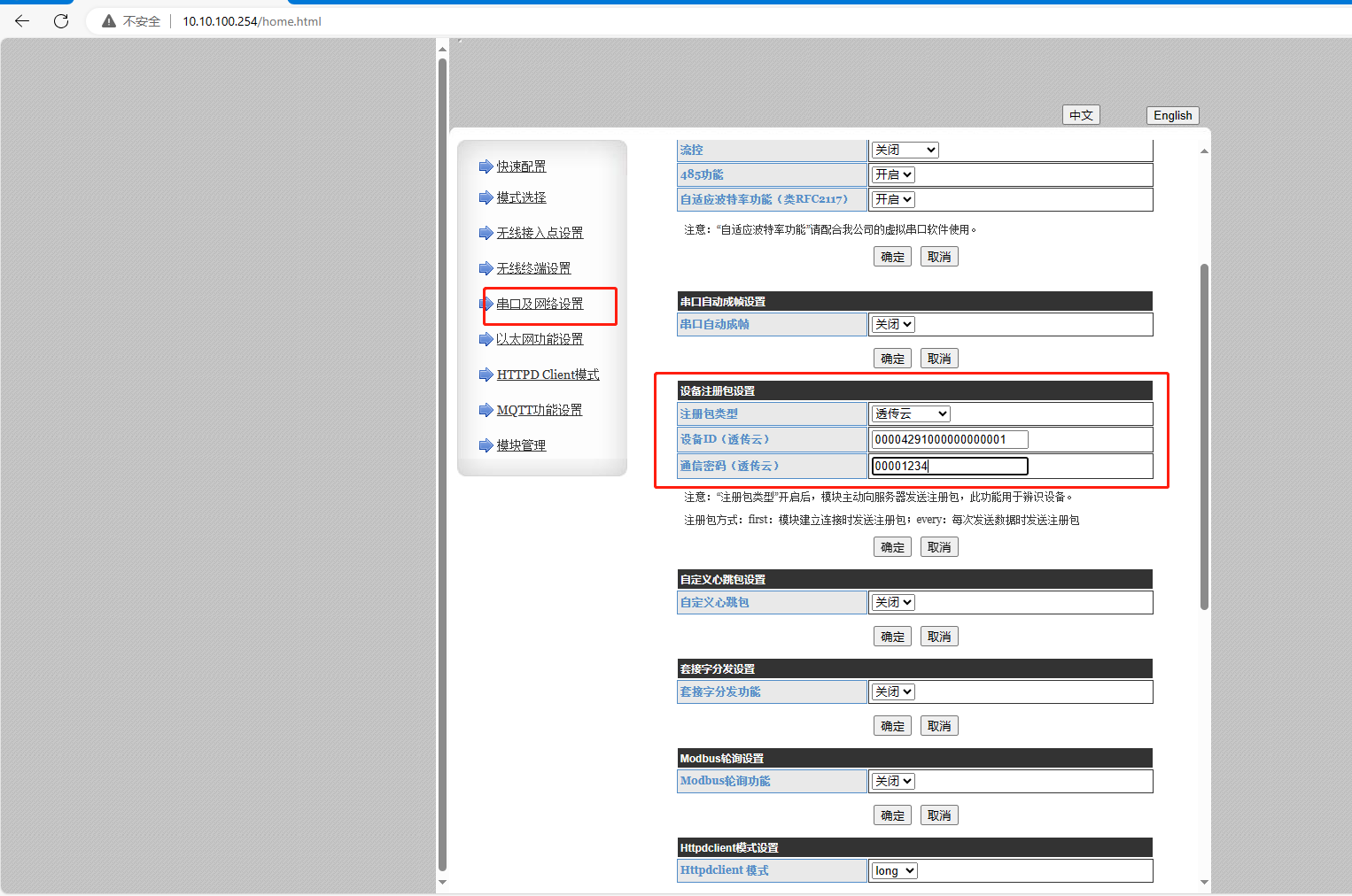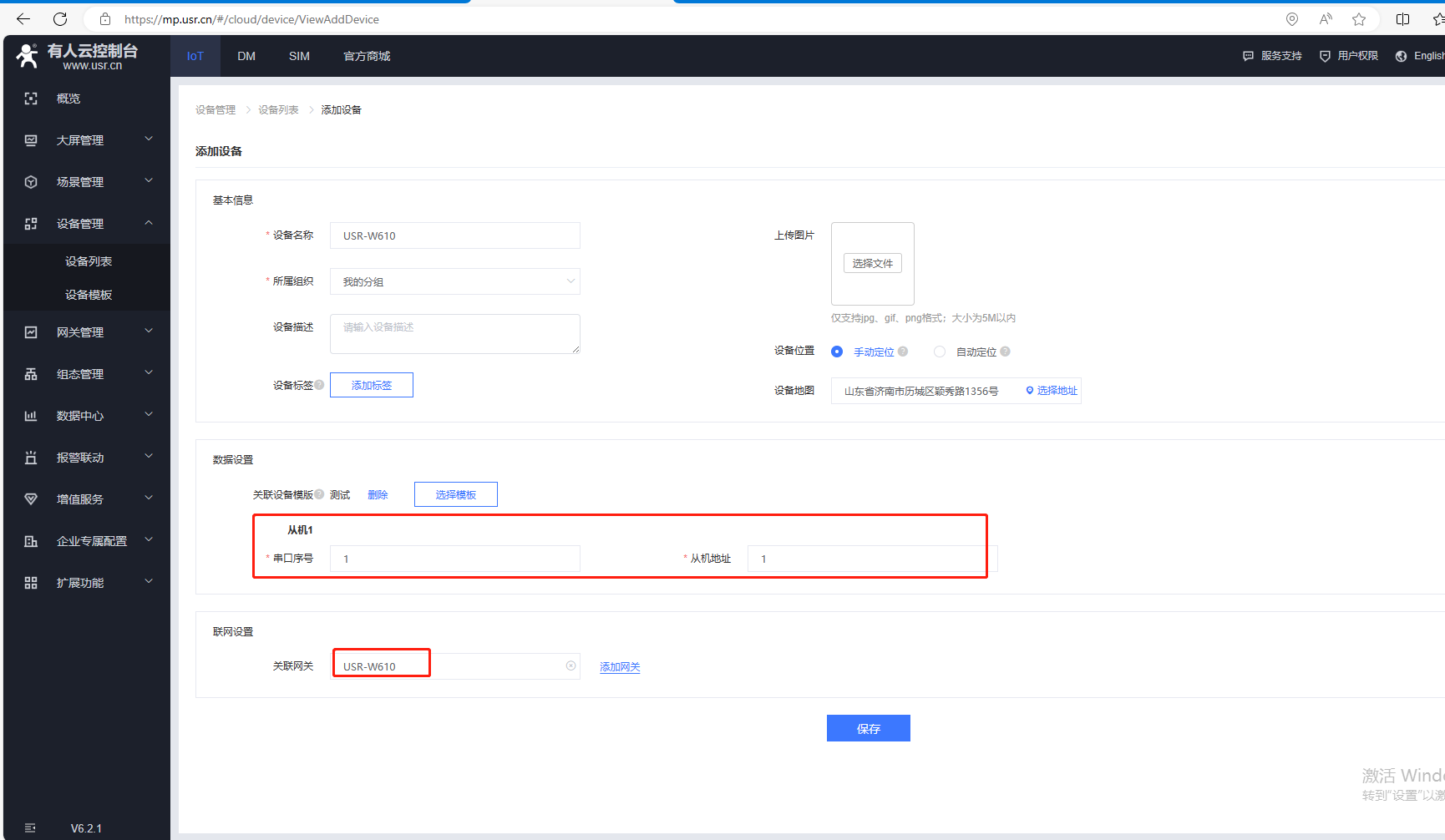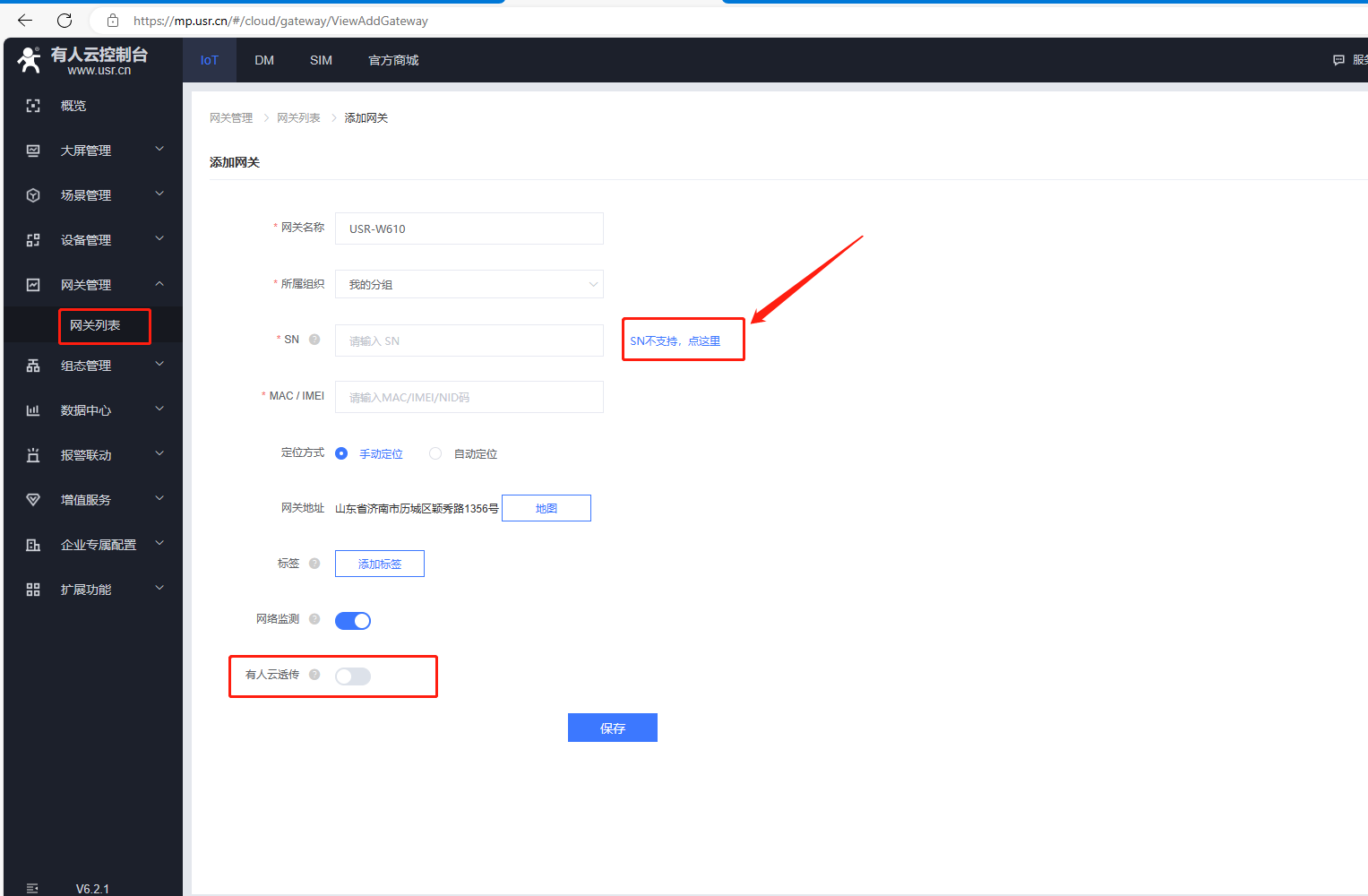 (2)W610添加有人云,點擊SN不支持點這里,有人云透傳功能需要關閉,點擊保存。