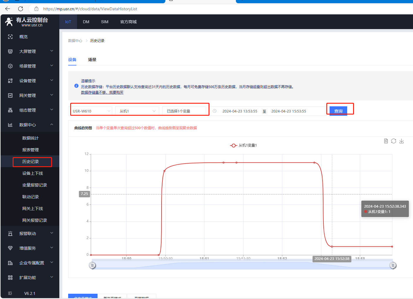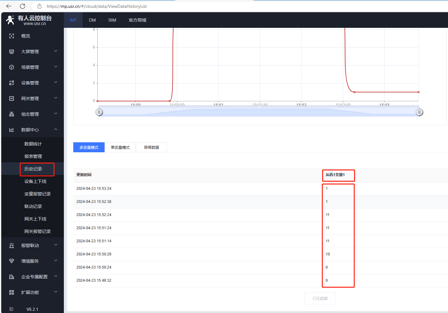 點開數據中心,點擊歷史記錄,可以查看有人云采集變量的歷史記錄。
