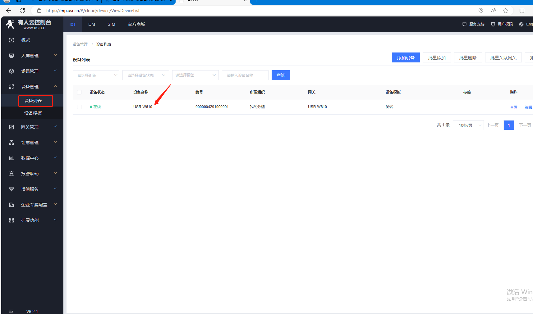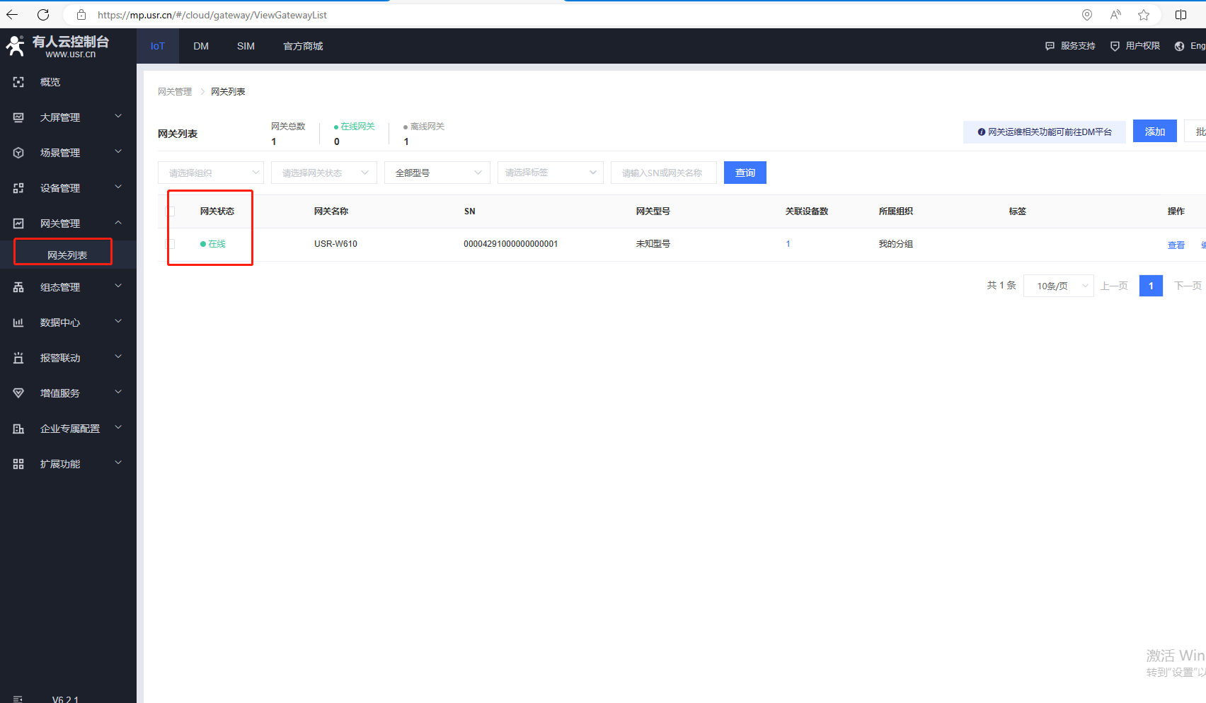 W610 STA模式連接可以聯外網的路由器,可以登陸有人云,看到網關列表、設備列表中,W610產品網關狀態是在線。